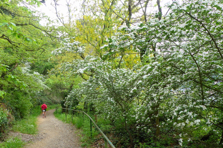 Beim Gedanken an Rundenläufe graute mir immer vor der Vorstellung, ein paar Dutzend Mal an den selben öden Stellen vorbeizukommen. Hier gibt es dagegen keinen Abschnitt, den ich nicht mag. Ich kann mich bei jeder Runde schon auf die nächste freuen. Natürlich ergibt sich bald ein gewisses Deja-Vu-Gefühl, wenn ich schon wieder unter dem blühenden Flieder hindurch laufe, erneut zwei besonders steile Treppen hinauf steige, wieder am Café Loreley vorbeikomme, aber besonders krass wird es, als in der siebten Runde schon zum vierten Mal an fast genau der selben Stelle eine Maus vor mir über den Weg rennt.