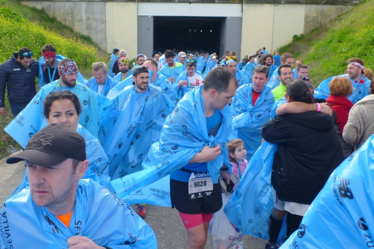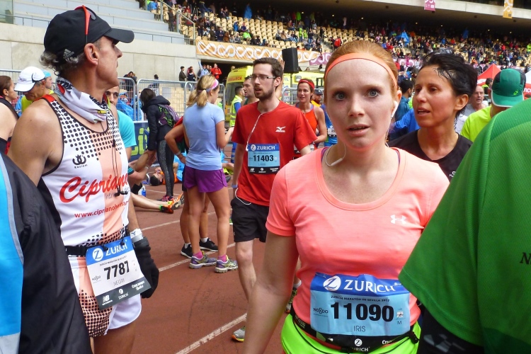 Der grau markierte Block für die 3:45- bis- 4:00 -Stunden-Läufer ist der vorletzte und zum Bersten voll. Wir kommen erst hinein, als sich das Starterfeld nach vorne bewegt. Unsere Sightseeingtour durch Sevilla mit über 10.000 Mitstreitern beginnt.