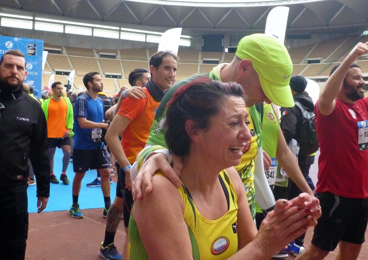Bei der Puente de la Barqueta, erbaut 1992, geht es ein zweites Mal über den Guadalquivir. Der Anstieg kommt denkbar ungelegen. Bei dem Bauwerk handelt sich um eine “Stabbogenbrücke mit schwingender orthotroper Fahrbahnplatte”. Keine Ahnung, was das ist. Der Begriff Orthotropie bezeichnet jedenfalls “Werkstoffe mit richtungsabhängigen Elastizitätseigenschaften”. Hauptsache, ich komme rüber. Vor uns der große Vergnügungspark. Noch mal eine Band. Bleiben zwei Kilometer. Ein Ergebnis unter 4 Stunden steht bereits fest. Aber vielleicht kann ich schneller als in Bad Füssing sein. Dauernd rasen Läufer an mir vorbei. Wo nehmen die jetzt noch ihre Energie her? Jeder Blick auf die Uhr zeigt nur 50 Meter mehr, aber ich halte mein Tempo. Es geht an einer Hochstraße vorbei. Unter ihr haben Boulderer Angriffspunkte für ihre Kletterübungen angebracht. Dann endlich das Estadio de la Cartuja oder eben Olympiastadion, erbaut im Zuge der - am Ende erfolglosen - Bewerbung für Olympia 2004. Durch das Südtor geht es hinunter in den Stadionbereich. Eine dreiviertel Runde wartet auf mich. Im Mittelbereich hat man Sand aufgeschüttet. Vielleicht für eine Dressurveranstaltung?