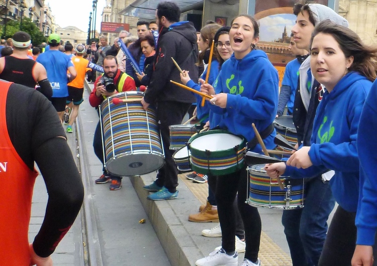Die nächsten 5 Kilometer verlaufen etwas ereignislos durch Wohn(block)gebiete und einige Straßen mit recht einfachen Häusern. Aber auch dort erfahren wir viel Zuspruch. Ich sehe eine Läuferin in den m4y- Trikotfarben. Eine Ähnlichkeit, die immer wieder auffällt. Die Littledown Harriers aus Bournemouth an der südenglischen Küste trifft man bei vielen Laufveranstaltungen. Einige Highlights erwarten uns nach km 14: Das Andalusische Parlament ist wunderbar herausgeputzt, gegenüber spielt eine Rockgruppe auf. Vor uns die Reste der römischen Stadtmauer aus der Zeit von Julius Cäsar. Westliches Ende der Altstadt mit zwei kurzen Überbleibseln eines Aquädukts. Schöne Gründerzeithäuser am Straßenrand. Und unheimlich viele Kirchen und Kapellen überall an der Laufstrecke. Auch das nicht wirklich aufregende Bahnhofsgebäude der Estación de Santa Justa passieren wir.