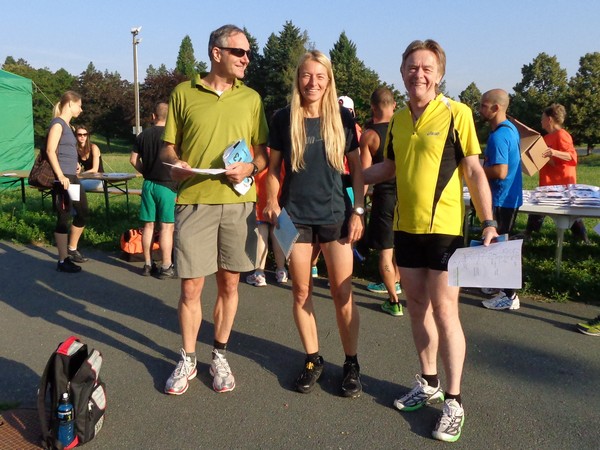 Ein paar sind losgebraust, als wäre es ein Sprintbewerb, da bin ich etwas zurückhaltender. Besonders ein tätowierter Hüne mit „MAGYAR“-Schriftzug am roten Shirt beginnt erstaunlich forsch. Kurz vor Ende der Jégpinec út begegnen mir bergauf u.a. Susanne und Willi, während ich noch runter laufe. Unten im Schatten eines Baumes dann die nächste Labestelle: Hier gibt es zum Wasser auch Waffeln, Erdnüsse, Melonen und Bananen. Für genügend Stärkung ist also gesorgt, trotzdem behalte ich meine Getränkeflasche bei mir.