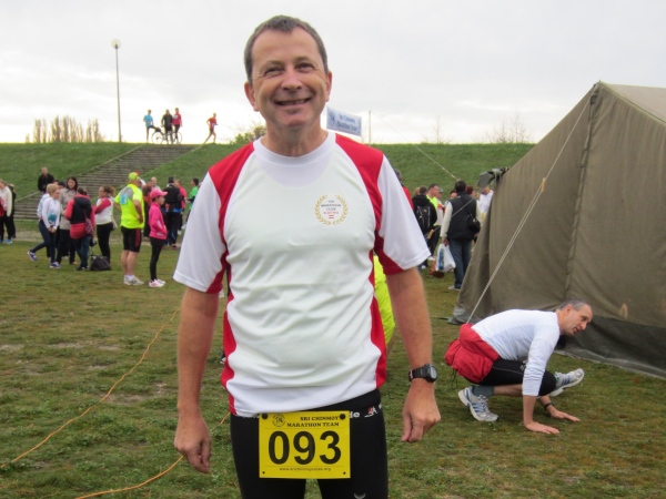 Jeder von uns nutzt die verbleibende halbe Stunde bis zum Start um 8 Uhr auf seine Weise – Werner betreibt Oberarmzirkeltraining, Josef isst einen Riegel, Börni lässt sich mit dem Clubshirt fotografieren – und ich treffe auf einen alten Bekannten, der kein Wort Deutsch spricht und den ich seit Jahren bei diversen Marathons in den ehemaligen Oststaaten sehe. Das letzte Mal in Kosice beim 90. Peace Marathon, wo er Vorletzter wurde. András, dessen Markenzeichen der weiße Schlapphut ist, hat bereits 350 Marathon absolviert und zählt zu den eifrigsten Sammlern in Ungarn.