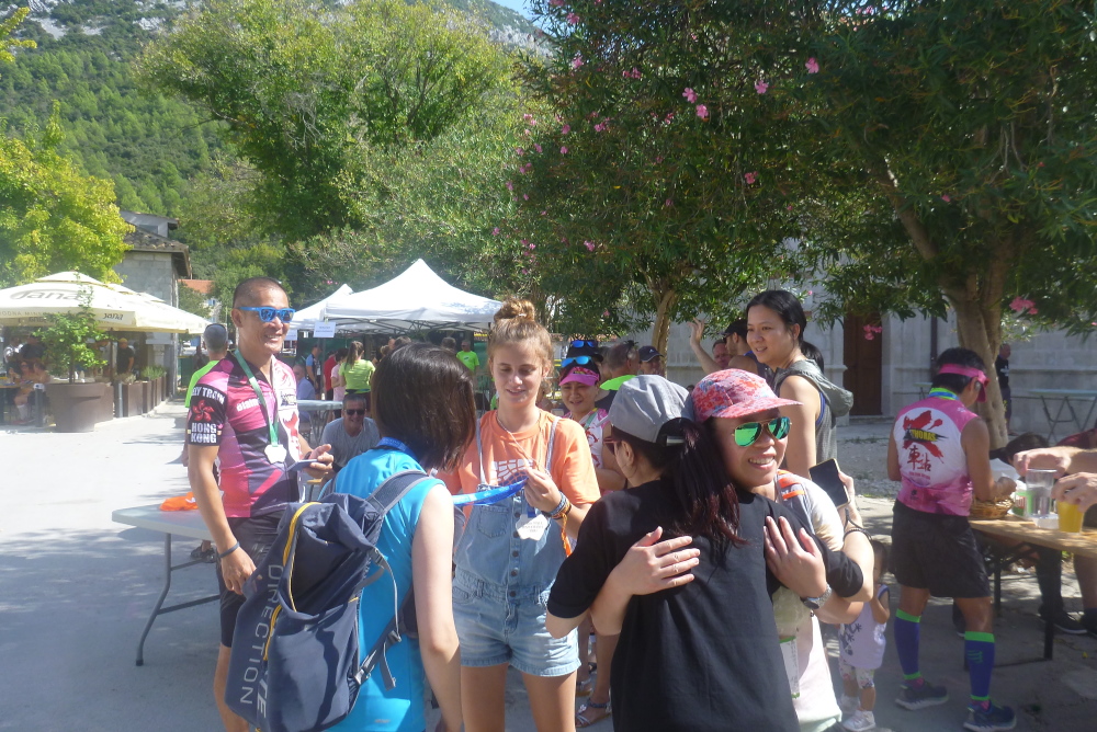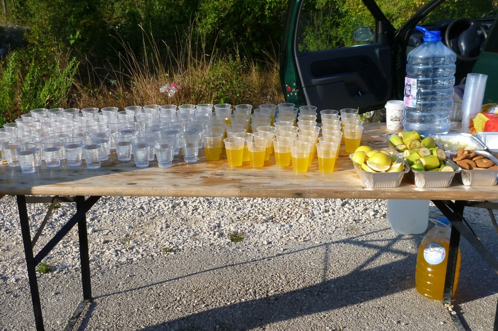 Die zweite Festung umrundend biegen wir, den kleinen Hafen zur Linken, auf die enge Straße ein, welche Bucht und Saline trennt. Hier erfolgt nach 4,5 km die erste Vollverpflegung: Wasser, Iso, Bananen, Kekse, Zitronenscheiben und Zucker. In Anbetracht der zunehmenden Wärme – ich bin bereits jetzt komplett durchnässt wie sonst nach zwei Stunden auf dem Laufband – nehme ich mir Zeit zum Verpflegen und trinke mindestens jeweils einen Becher Wasser und Iso. Wunderschön spiegeln sich die Berge im Salzwasser und wer zurückblickt, entdeckt auch große Teile der Mauer als Spiegelbild in der ganz ruhigen Bucht. Kurz bevor wir das 90 Einwohner-Dörfchen Broce betreten, geht’s rechts ab und damit wartet die zweite erhebliche Steigung auf uns. Natürlich habe ich das Streckenprofil studiert, das nach etwa 400 HM aussieht. Von meinen Trainingsläufen kenne ich aber das ständige Auf und Ab und kalkuliere eher mit deren 700.