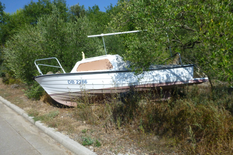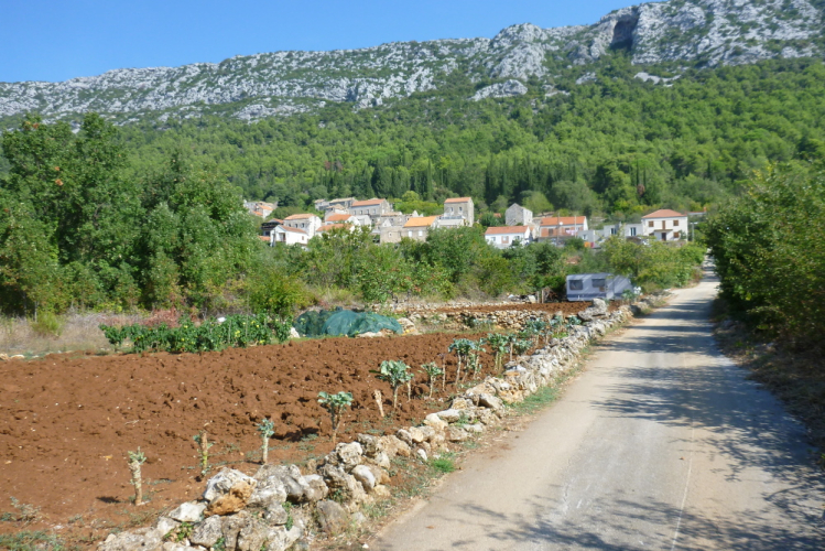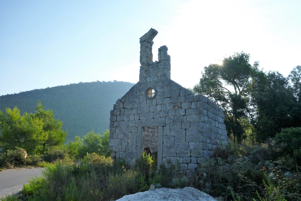 Der Weg führt zum Weiler Pržina und zum Strand Kobaš, die wir aber beide nicht erreichen werden. Eine gut asphaltierte schmale Straße bietet sich uns, da sind mit Sicherheit jede Menge EU-Mittel angelegt worden. Überhaupt befindet sich die Infrastruktur Kroatiens in einem bemerkenswert guten Zustand, ich habe Vergleichsmöglichkeiten mit dem aus den mittleren Achtziger Jahren. Bemerkenswert ist auch die für Kroatien nicht unbedingt typische dichte Vegetation, die ein Laufen im Grünen erlaubt. Nach dem zweiten VP stehen rechts die Ruinen eines ehem. Wohnhauses und einer Kirche. Unklar bleibt, ob wir normale Alterserscheinungen vor uns haben, oder die Schäden im Befreiungskrieg Anfang der Neunziger Jahre bzw. beim letzten großen Erdbeben 1996 entstanden sind. In diesem Jahr wurden auch Ston und natürlich die Mauer inkl. der Festungen erheblich in Mitleidenschaft gezogen.