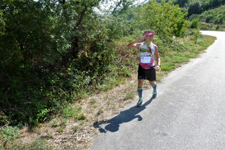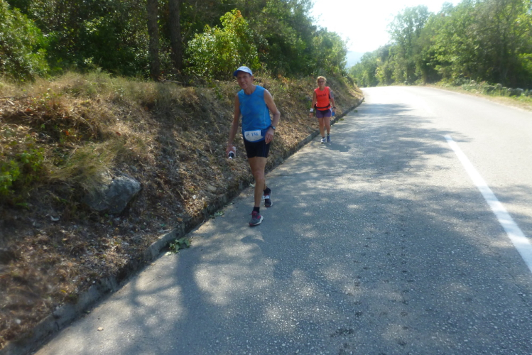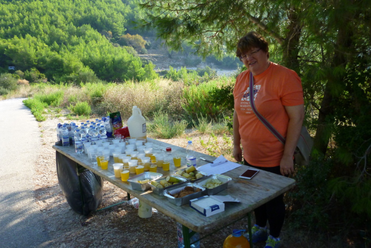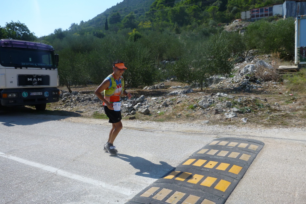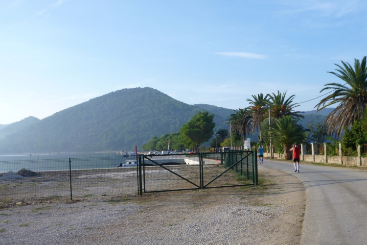 Dann, unmittelbar vor dem Ortseingang von Duba Stonska, sind 35 km geschafft und ich darf den Rückweg antreten. Der natürlich nicht weniger anstrengend wird, aber ich gebe mein Bestes und genieße wirklich die atemberaubende Landschaft, auch wenn ich ganz schön platt bin und immer langsamer werde. Hilfreich ist für mich, dass ich gedanklich auf den letzten sieben km Elkes Standardstrecke um den Niederbreitbacher Sportplatz ablaufe, was den zu bewältigenden Rest schön plastisch macht. Luka hat einen tollen, kleinen Hafen, dem ich unbedingt noch einen Besuch abstatten muss. Nach 41 km darf ich an der Kreuzung, die mich auf diese Begegnungsstrecke geführt hat, geradeaus laufen. Noch sind längst nicht alle Läufer auf sie eingebogen, was werden die noch über Stunden in der Hitze leiden müssen!