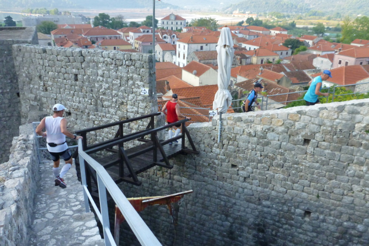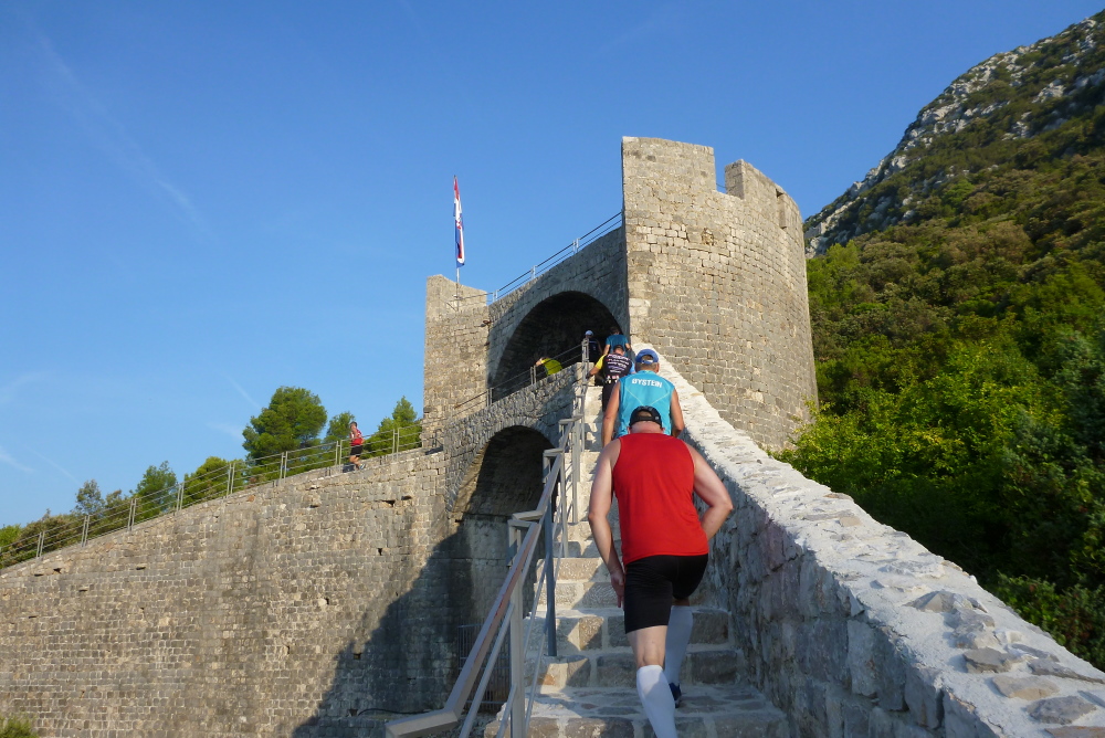 Regional bekannt ist Mail Ston aber nicht nur wegen der Mauer, sondern v.a. wegen der hier betriebenen Muschel- und Austernzucht, auf welche die Einheimischen besonders stolz sind. Die sonst übliche Eintrittsgebühr von 70 Kuna (ca. 9,50 €) auf die Mauer müssen wir natürlich nicht entrichten, dafür geht’s direkt stramm aufwärts. Diesen Abschnitt rennen sicherlich nur die Führenden, meine Preisklasse, genauer gesagt praktisch alle, schleppen sich im Gänsemarsch steil über unregelmäßige Treppenstufen bergauf. Spätestens hier zeigt sich die Sinnhaftigkeit des heutigen Doppelstarts, denn die drei- bis vierfache Läuferzahl würde die Strecke ganz schön verstopfen. Traumhaft ist der Blick zurück aufs Städtchen, dessen Dächer und kleiner Hafen in der Morgensonne leuchten. Wohl dem, der sich diese Blicke genehmigt und nicht auf Teufel komm raus vorwärtshastet. Es sind die wenigsten.