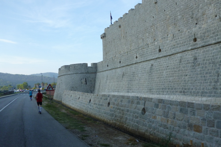 Früh ist die Nacht am Sonntag beendet, denn der Marathon wird bereits um 7:30 Uhr gestartet. Eine sinnvolle Maßnahme, denn die morgendlichen 22° werden bei eitlem Sonnenschein rasch auf deren 30 steigen. Die beiden anderen Disziplinen (Elke wird die 15 km unter die Füße nehmen) beginnen eine halbe Stunde später. Die Chinesen vollführen noch ein umfangreiches Aufwärmprogramm, die (vermutete) Bürgermeisterin hält eine flammende, zweisprachige (kroatische und englische) Rede, dann geht es zur Sache. Die Startaufstellung erfolgt auf der nach Mali Ston führenden Hauptverkehrsstraße, die in der Zeit, die wir für den ersten guten km benötigen, halbseitig gesperrt sein soll, jedoch hält sich nicht jeder daran. Ehrfurchtsvoll gehen die Blicke nach oben, denn wir können einen guten Teil unserer Laufstrecke auf der Mauer erkennen, und die wird es in sich haben. Die kurze Einlaufphase findet ihr schnelles Ende, als wir eingangs Mali Ston beim ersten der drei markanten Forts ankommen, welche durch die Mauer miteinander verbunden sind.