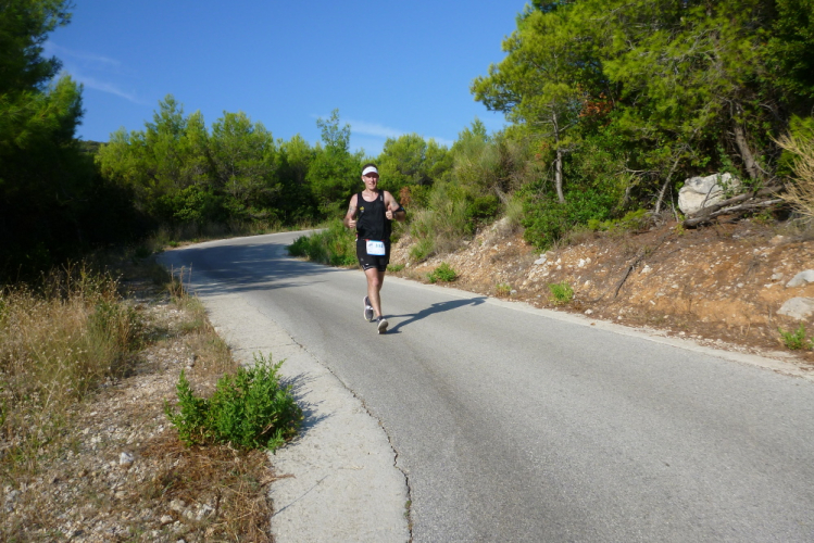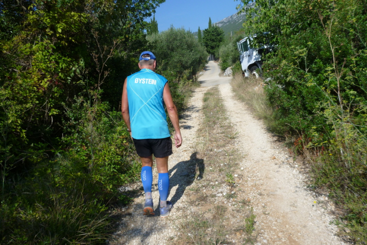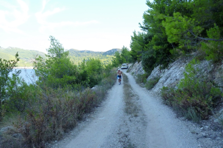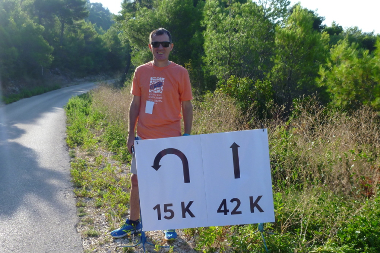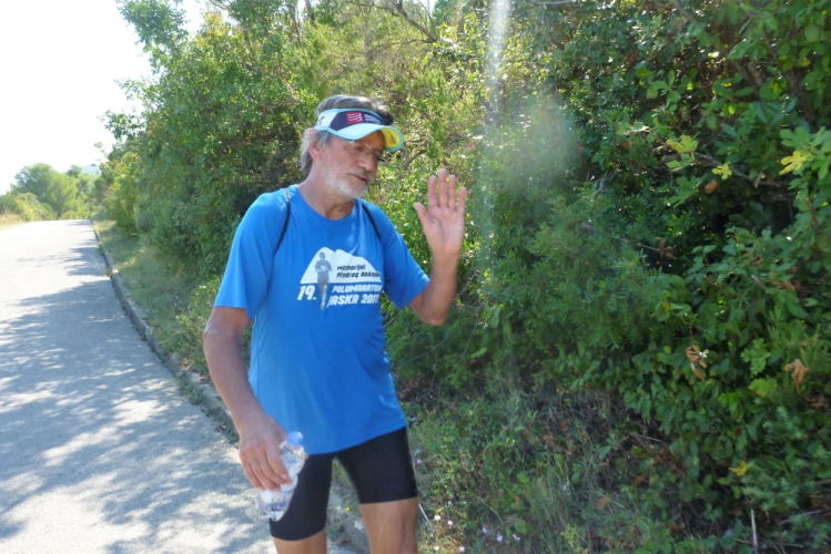 Nach zweieinhalb km ist diese Schinderei beendet und ich habe wieder Asphalt unter den Füßen, der mich bergauf nach Češvinica, einem 60 Einwohner-Dörfchen führt. Nach anderthalb weiteren und jetzt insgesamt 28,5 km beginnt die zweite, fünfeinhalb km lange Begegnungsstrecke auf einer breiten, asphaltierten und gut ausgebauten Straße. Allerdings, und das kommt auf dem Höhenprofil gar nicht so deutlich zur Geltung, geht es weiter munter rauf und runter, und das ist bei der heutigen Hitze eine echte Herausforderung. Dessen ungeachtet werde ich erneut mit tollen Panoramen belohnt, darüber hinaus kann ich wieder die Führenden beobachten, die zumindest äußerlich einen deutlich entspannteren Eindruck vermitteln als ich mich fühle. Zypressen bei Hodilje lassen einen in der Toskana wähnen, die Aussichten über die Bucht und den Eingang der Insel sind grandios. Allerdings lassen sie mich die Anstrengungen nicht vergessen, die Hitze ist mörderisch. Was jammere ich? Beim Badwater-Ultramarathon im US-amerikanischen Death-Valley über 217 km kämpfen sie tagsüber mit bis zu 50° Celsius.