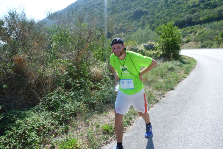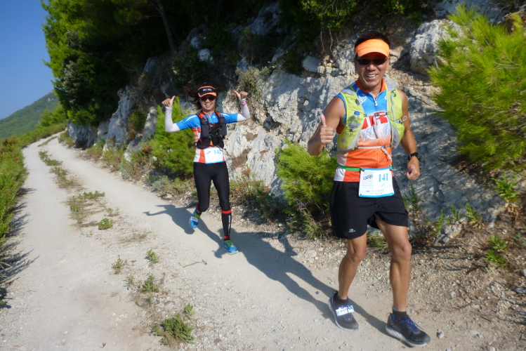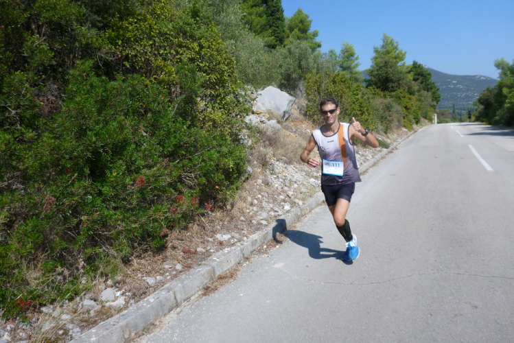 Rechts bieten sich traumhafte Blicke aufs Meer und die Küste. Es ist ein Jammer, dass die kleine Kamera das angesichts der für sie ungünstigen Lichtverhältnisse nur sehr eingeschränkt einfangen kann. Ein wunderschönes Panorama jagt das nächste. Ich überschreite den Wendepunkt des 15 km-Laufs, der die Läufer zurück nach Ston führen wird. Unserer wird gute fünf km dahinter, kurz vor dem Ende ostwärtigen Ende der Halbinsel Pelješac, liegen. Kurz nach der 10 km-Marke beginnen mir die Führenden entgegenzukommen. Wie immer ist das sehr kurzweilig und imposant zu beobachten, in welchem Tempo die Jungs unterwegs sind. Die spätere Gesamtfünfte wird am Ende in 3:51 Std. die einzige Frau sein, die vor mir das Ziel erreicht. Schön, dass fast alle gut gelaunt sind und in meine Kamera grinsen. Nach der dritten Verpflegung verlassen wir die Asphaltstraße nach rechts und wechseln auf einen Schotterweg. Der Vorjahressieger, ein Spanier, begegnet mir strahlend, er wird heute in 3:30 Std. Dritter werden. Der australische spätere Gewinner wird es bereits nach knapp 3:08 Std. geschafft haben. Christian Schreiner wird als Neunter in 4:02 Std. meine finstere Absicht vereiteln, schnellster Germane zu werden.