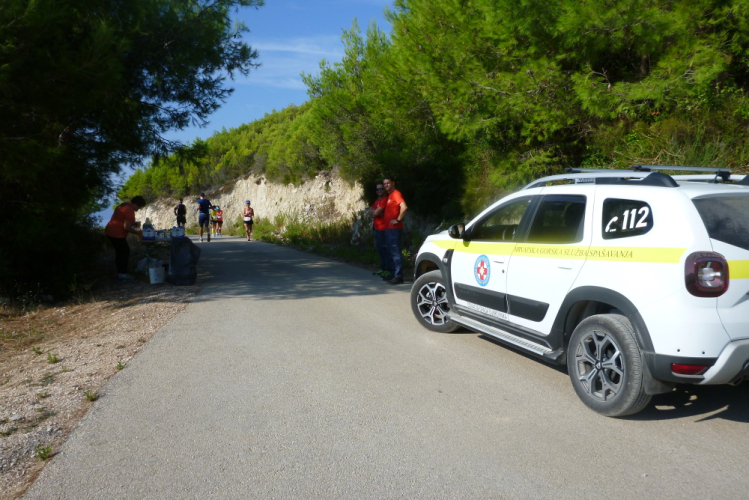 Wieder vorbei am frisch angelegten Weinberg und den vielen tollen Aussichten, die ich ja schon von meinem Trainingslauf her kenne, komme ich nach vielen Aufs und Abs – auf denen uns übrigens tatsächlich die kroatische Bergwacht sichert! - wieder am Wasser an und habe nach 2:24 Std., etwas flotter als gedacht, Halbzeit. Der Median bei der letztjährigen, zehnten Ausgabe lag bei 4:58 Std., einer Zeit, die ich für mich als erstrebenswert und machbar erachte. Schön sind die Gärten der Häuser an der Bucht mit ihren Oliven-, Oleander-, Granatapfel- und sonstigen Bäumen. Dann habe ich nach rund 25 km Ston wieder erreicht und bin erfreulicherweise nicht auf Elke aufgelaufen, die ihre 15 km schon erfolgreich hinter sich gebracht hat.