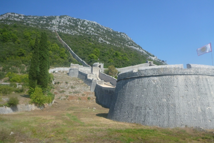 In der Annahme, dass auch Ihr der Aufklärung bedürft: Im Süden der dalmatinischen Küste liegt, nur mit einem schmalen Isthmus (Landenge) mit dem Festland verbunden, die 75 km lange und bis zu 7,5 km breite Halbinsel Pelješac. Im 14. Jahrhundert rissen sie die Herren von Ragusa (heute Dubrovnik) an sich, weil diese Ecke als Eingang zu ihrem Territorium überragende strategische Bedeutung besaß. In den Folgejahren entstand ab 1333 eines der architektonischen Wunder der Adria, nämlich eine mittelalterliche Festungsarchitektur: Eine heute noch 5,5 km lange Mauer mit 41 Wehrtürmen und 7 integrierten Bastionen, welche die Städtchen Mali (Klein) Ston im Norden (150 Einwohner) und Veliki (Groß) Ston im Süden (550 Einwohner) verband und sicherte. Das erst nach mehreren Generationen im 15. Jahrhundert unter Beteiligung sämtlicher führender regionalen Architekten fertiggestellte Bauwerk galt seinerzeit als Höhepunkt der Festungsbaukunst.