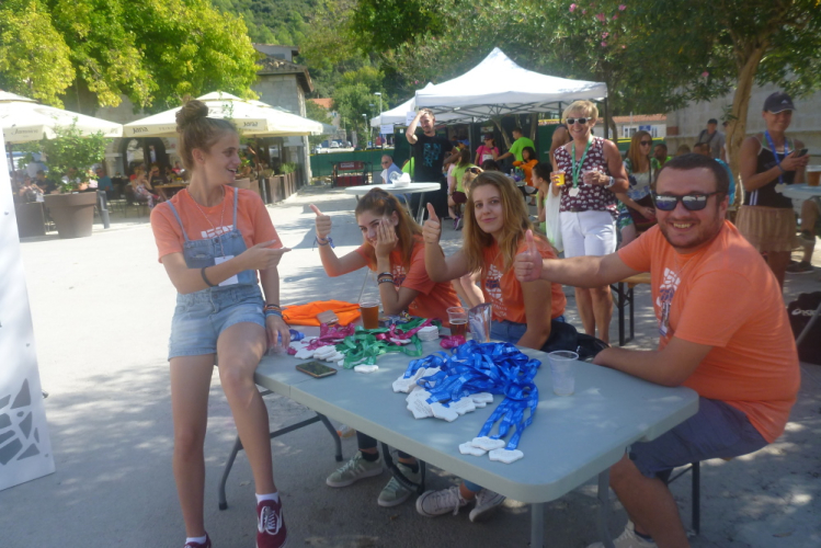 Wie dem auch sei – am Samstag ab 12 Uhr ist Ausgabe der Startunterlagen, mitten im Herzen der kleinen Altstadt von Veliki Ston. Atemberaubende fünfzig Meter Fußweg trennen unsere Unterkunft von ihr. Würden wir die gebotenen Leistungen einzeln kaufen wollen, überstiege dies die 39 zu zahlenden Euro deutlich: Funktionsshirt, Rucksack, Salz aus Ston (auch dazu später mehr), eine Flasche Wein, Pasta Party, Mittagessen nach dem Lauf, frei herunterladbare Lauffotos, Medaille – was will man mehr? Noch nie erlebt und ablauftechnisch wirklich klug: Die vorbereiteten nummerierten Starterbeutel werden wie bei Rapunzel Stück für Stück aus einem Fenster im ersten Stockwerk heruntergelassen.