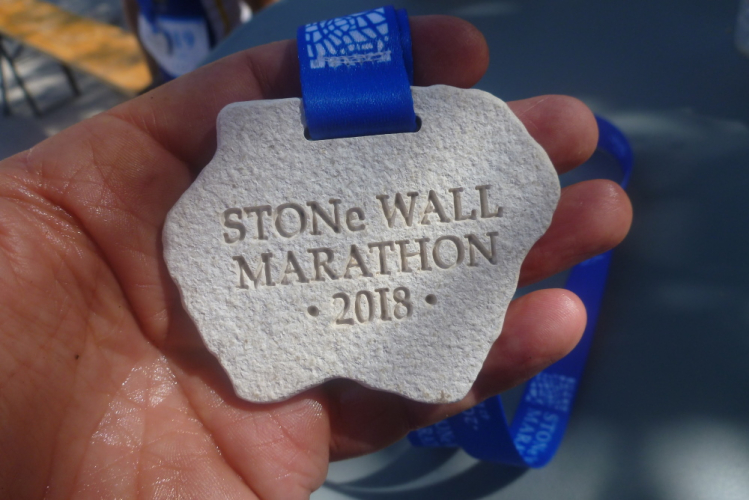 Zwölfhundert Meter noch, das ist jetzt wirklich absehbar, und wenn ich mich recht erinnere, hat mich außer ganz am Anfang niemand überholt. Also geht es dem Rest mindestens genauso wie mir. Halleluja, das Stoner Ortseingangsschild ist erreicht! Schon ist die Festung in Sicht, bald darauf umrundet, ein Ordner begleitet mich netterweise ein paar Meter zum Haupteingang ins Städtchen. Dort steht Elke, frisch dekoriert und geduscht, und klatscht nicht als Einzige Beifall. Im Restaurant zur Linken zollt man ebenfalls Respekt, dann biege ich auf die letzten Meter des kurzen Zieleinlaufs ein. Es macht Pieps (Einwegchip im Schnürsenkel) und es ist vollbracht.
