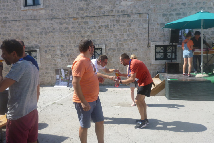 Noch bevor man mir die tolle steinerne Medaille umhängen kann – ein ganz besonderes Stück in meiner reichhaltigen Sammlung – mache ich einen auf Papst Johannes Paul II., knie nieder und küsse den kroatischen Zielbereich. Das Volk amüsiert sich natürlich und glücklicherweise komme ich ohne fremde Hilfe wieder auf die Beine. Der Rest ist Trinken, Trinken, Trinken. Essen kann ich leider nach einem Marathonlauf nie etwas direkt, so muss ich das leckere Nudelgericht mit Muscheln (anders als am Vorabend) stehenlassen. Eine Zwei-Mann-Combo spielt zünftige Musik, ansonsten gibt’s Flottes aus der Konserve. Jeder Einlaufende wird lautstark begrüßt und ich übergebe den Fotoapparat an Elke, um die 50 Meter in unsere Ferienwohnung zum Duschen zurückzulegen.