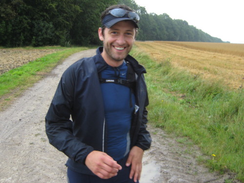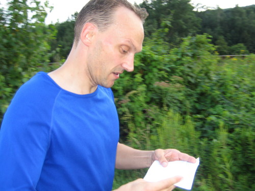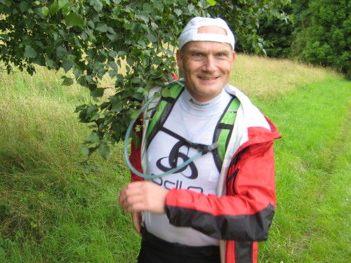 An der Verpflegungsstation bei km 59,4 treffen wir auf Matt Tilly, ein Läufer aus Missouri/USA, der alle 3 Jahre mit seiner Familie in Deutschland Urlaub macht. Er hat sich verlaufen und Sibbesse noch nicht wiedergesehen; im Wald ist er direkt auf die zweite Runde geraten. Theoretisch kein Problem, Hansi hat ihm telefonisch schon mitgeteilt, dass er die fehlenden 8 km in Sibbesse anhängen kann. Er lässt sich die gute Laune aber nicht nehmen, steigt dann aber doch nach der zweiten Runde aus.
