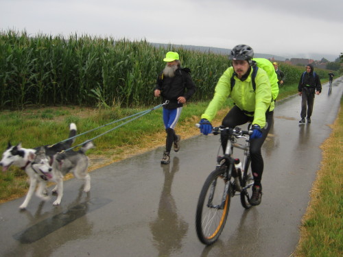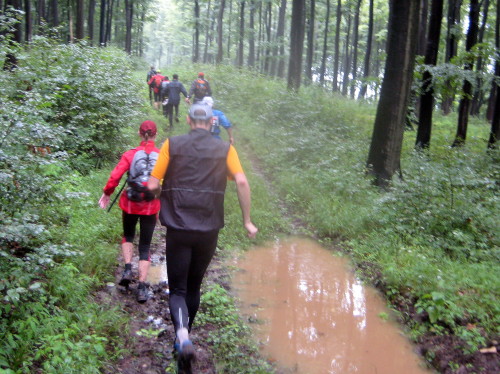 Es folgt ein wahrer Schlammweg, aber wir haben Glück: Aus dem Morast kommt der Fuß immer zusammen mit dem Schuh heraus. Auf dem Kamm werden wir mit einem schönen Pfad aus weichem Waldboden entschädigt. Bald darauf geht es auf einem legendären Weg bergab ins Tal: Zuerst muss man nur durch hohes Gras, das aber zunehmend mit Brennesseln durchsetzt ist. Und der Untergrund ist schlammig: keine Chance, schnell zu laufen. Wer sich hier lang legt, hat länger was davon. Kurz vor Everode treffen wir Stefan Hloucal mit seinen beiden Huskies, die schneller unterwegs sind als ihm lieb ist. Bis km 144 quält er sich mit den Blasen an den Füßen, dann muss er aufhören.