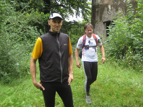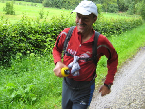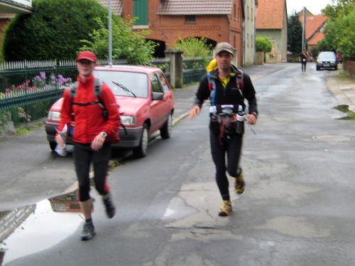 Plötzlich ist Franz Häusler, der alte Haudegen vom Trans-Europa-Lauf (Lissabon - Moskau), vor uns. Er hat Wadenkrämpfe und muss den Fuß vom Gas nehmen. Aber er ist erfahren genug, um das Problem in den Griff zu bekommen. Nach der Stärkung in Everode – dieses Mal mit Sonneneinstrahlung – geht es wieder in den Wald, zunächst mit einem erträglichen Anstieg.