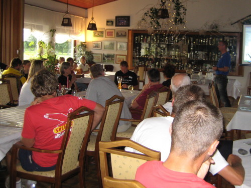 Außer mir kommen noch drei aus Nordhessen: Elisabeth Herms-Lübbe, die diese Veranstaltung besonders in ihr Herz geschlossen hat und schon zum dritten Mal dabei ist, außerdem Andree Morth und seine Partnerin Dorothe Wolf, die beide mit hervorragenden Zeiten an dem diesjährigen Ironman-Wettbewerb teilgenommen haben. Außerdem sitzen noch Karl Gerlach und Thomas Ehrig am Tisch. Karl ist noch nicht über 100 km gelaufen, aber ein ausgesprochen schneller Läufer, der z. B. 50 km in 3:40 h abspult (Marburg 2007). Thomas ist den Bödefelder Hollenlauf (101 km) und macht einen sehr zielorientierten Eindruck. Außerdem engagiert er sich für die World Humanitarian Marathon Foundation (WHMF) und berichtet vom Sahara-Marathon und –Ultra, den die deutsche Sektion veranstaltet. Auch Heinrich Dahmen, der in Wörschach schon 24 Std. gelaufen ist, nutzt sein Laufen für ein ehrenamtliches Engagement als Sponsorläufer für TSD (Touberöse Sklerose) und für eine Kinderkrebsklinik und hat in 3 Jahren schon rd. 14.000 EUR erlaufen. Der Abend endet mit einem schönen Abendrot, ein viel versprechendes Zeichen für den kommenden Lauftag.