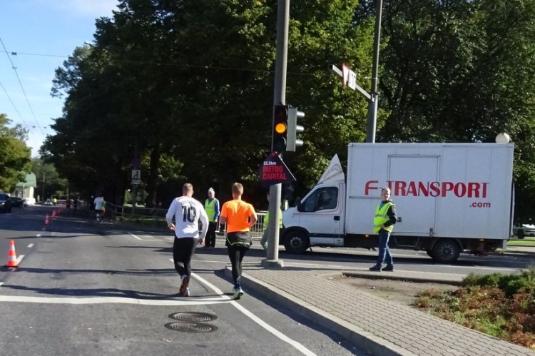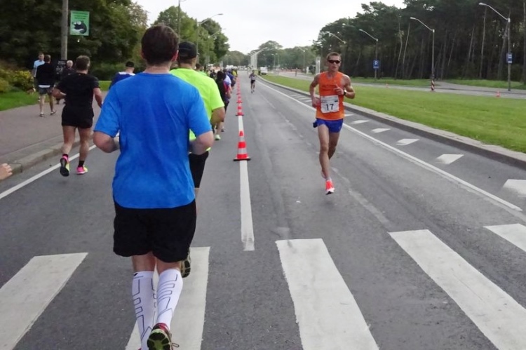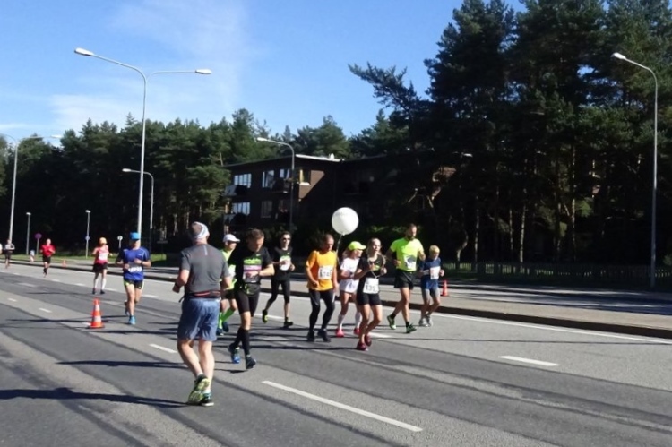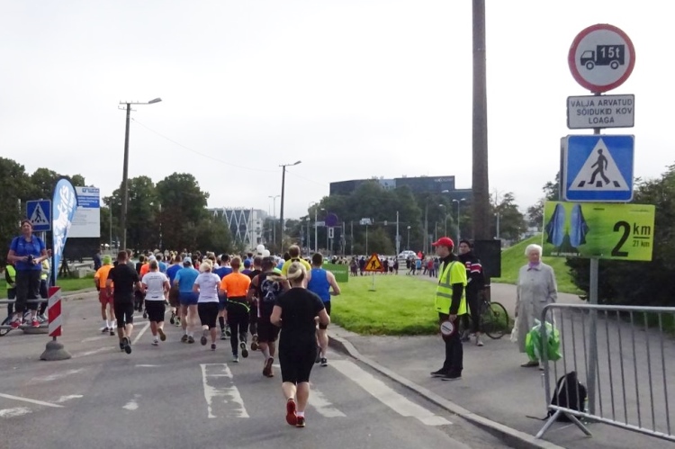 Angenehm empfinde ich, dass endlich wieder einmal bei einem Marathon alle Straßen gesperrt sind, man braucht sich nicht zu sorgen, dass einem von hinten ein Auto zu nahe kommt. Der Marathonkurs verläuft nun weiter in Richtung Osten, vorbei an der Universität von Tallinn. Noch ist das Feld sehr dicht, als wir bei Kilometer 5 zur nächsten Labe kommen. Unter den Helfern sind zahlreiche Schüler, die laut „vesi, vesi“ schreien. Neben Wasser gibt es auch Iso, Salz, (geschwefelte) Rosinen, Zucker, Bananenstücke und Schwarzbrot. Ich bleibe vorerst nur beim vesi, das noch nicht zu warm ist.