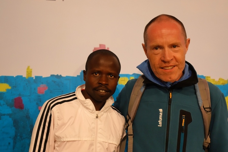 Ich treffe direkt auf die Favoritentruppe aus Kenia. Die schlaksigen Jungs sehen echt schnell aus. Einen der Burschen, er hat eine PB von 2.10 Std., erkläre ich zu meinem Favoriten. Aber wer plaudert denn dort mit den Jungs aus Kenia? Es ist Manfred Steffny, Olympiateilnehmer im Marathon 1968 in Mexiko und 1972 in München. Ich erkläre meinem kenianischem Freund, wer Manfred ist und er zeigt Respekt.