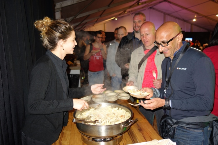 Die Pasta Party steht ab 18 Uhr auf dem Programm. Es gibt verschiedene Nudeln, Gnocchi, Salate, Vorspeisen, leckeres zum Dessert. Und Getränke, sogar Bier vom Fass. Ich bin schon neidisch auf all die vielen Läufer, die da morgen auf die Strecken gehen werden.