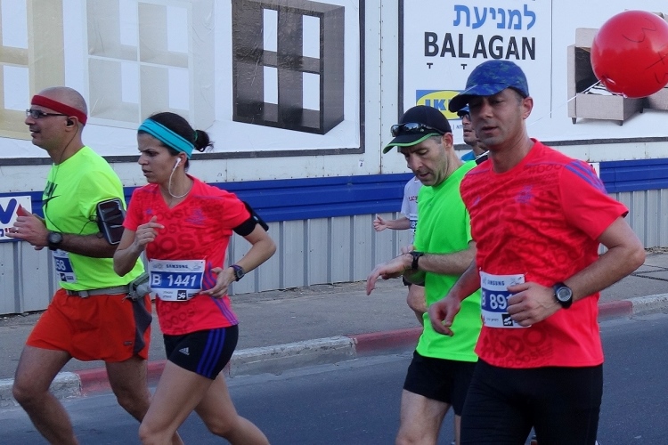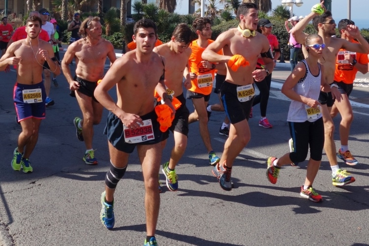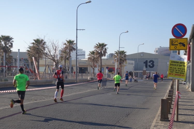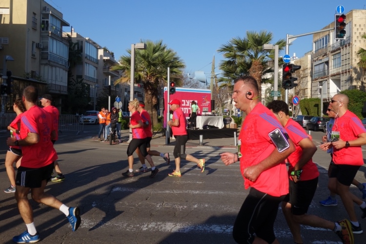 Auf der breiten vierspurigen Hayarkon ist die Spitze auf Höhe meines Hotels schon durch. Aber die Spitze interessiert mich nicht so sehr. Ich radele der Masse entgegen. Und die kommt langsam ab dem Alten Hafen. Die Läufer haben hier schon 13 Km in den Beinen und alles sieht gut aus. Es fallen mir hier schon viele Läufer mit nacktem Oberkörper auf. Meistens mit nach oben sich windenden Strippen für die Ohrstöpsel der Musikplayer.
