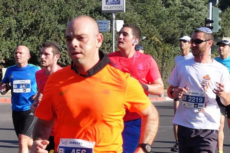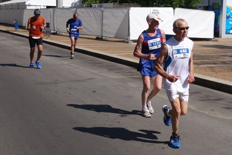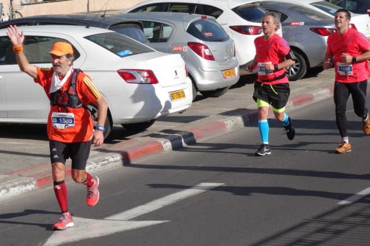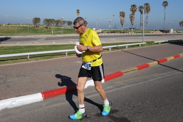Die Marathonis müssen nach dem Start am Shtern Mordekhai Khayim Square erst noch eine Runde um den Dov Hoz Flughafen laufen. Sie kommen dann durch den Alten Hafen, und da will ich sie erwarten. Meine Fahrradstation ist auf der Dizengoff. Und dort laufen die Zehner in Massen rum. Insgesamt starten heute 19.000 Zehner. Mitten drin ist Manfred Steffny. Und schon ist er auf einem Foto. Ich löse mich von den Zehnern und fahre den Marathonis entgegen.