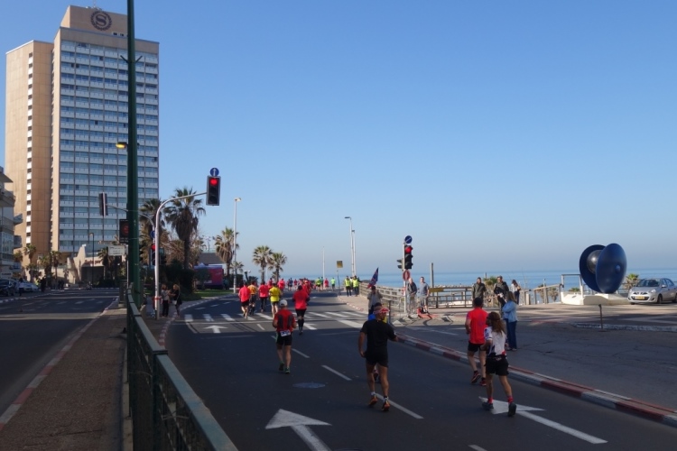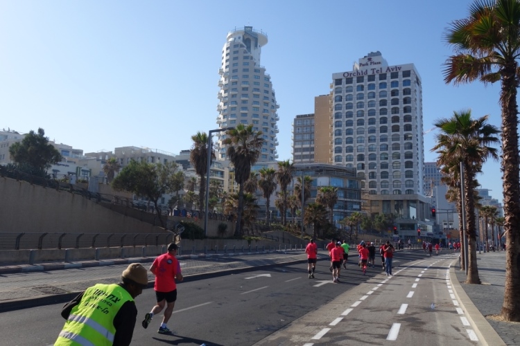 Die Streckenführung macht mir das Verfolgen der Marathonis einfach. Ich muss nur auf die andere Seite der vierspurigen Straße und treffe auf die aus Jaffa kommenden Läufer. Das Meer liegt nun zur Linken, rechts ist die beindruckende Skyline von Tel Aviv vor den Läufern.