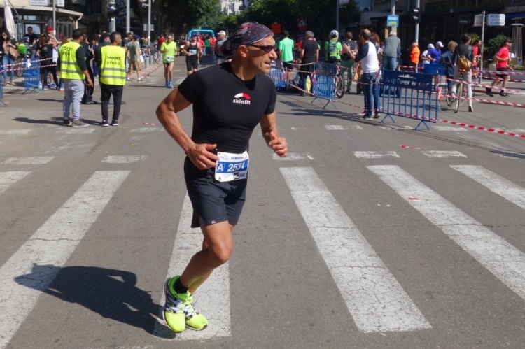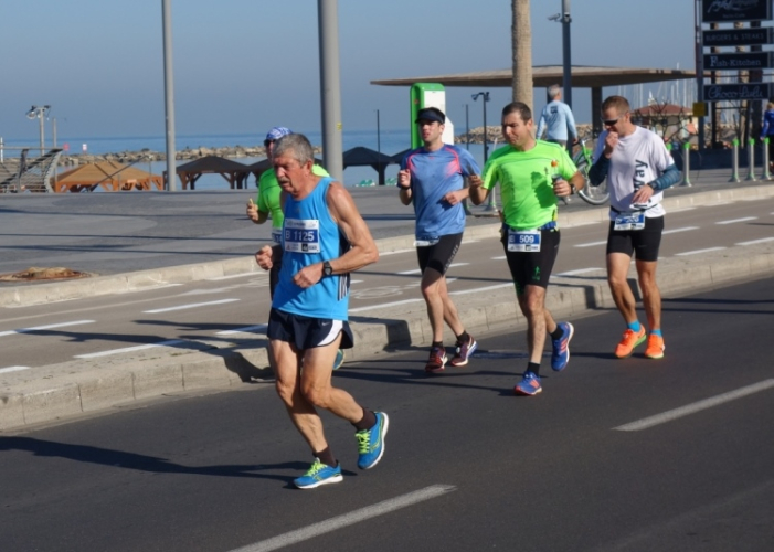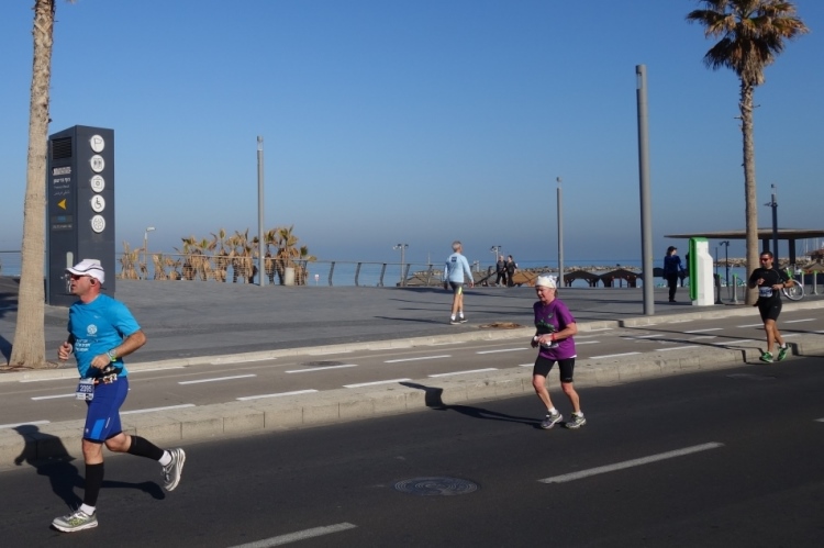 Es geht rechts herum in die Ben Gurion. Allerdings wird das Feld wieder geteilt. Alles was nicht blau ist, läuft auf der linken, die Blauen auf der rechten Seite. Und dazwischen liegt ein palmenbestandener breiter Grünstreifen. Ich sehe Massimo, einen Italiener aus Elba, den ich gestern Abend bei der Pasta Party traf. Er sieht gut aus. Wird wohl deutlich unter vier Stunden ins Ziel kommen.
