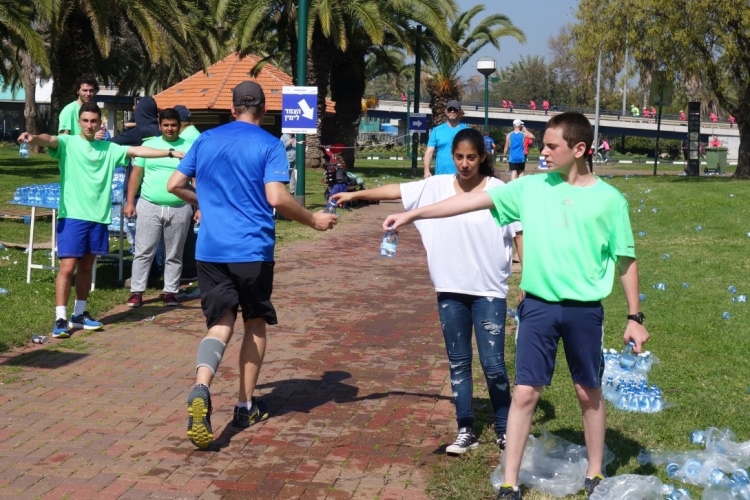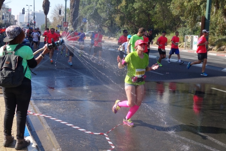 Die Läufer stoßen auf den Hinweg. Links liegen das Meer und viele hohe Hotelbauten, der Beton des Hayarkon Tunnels wartet. Es folgt bei Km 34 linker Hand der Independence Park. Eine Helferin hat einen Wasserhydranten angezapft und hält den Schlauch auf die Läufer. Die nehmen das erfrischende kühle Nasse gerne an. Es ist mittlerweile auch schon über 20 Grad warm.