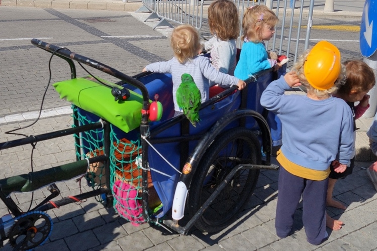 Immer wieder sind schöne Bauten zu sehen, die an Bauhaus erinnern. Zum Teil versucht man den Bauhausstil auch bei Neubauten mit einfließen zu lassen. Ein interessantes Spezialfahrrad steht am Abzweig. Hinten sind Bobbycars angebracht, vorne sind sechs Kleinkinder und ein Papagei in einem Kasten.