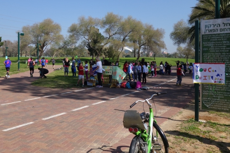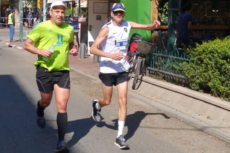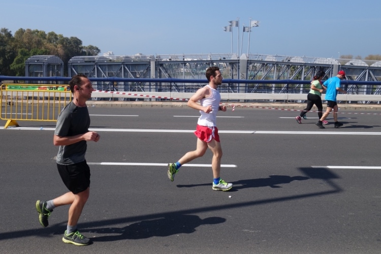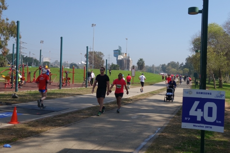 Ich sehe den Vierstunden Zug- und Bremsläufer. Zug- und Bremsläufer gibt es von 3.15 - 4.45 Std., übrigens auch für HM, 10er und 5er. Bei Km 39 wird der Yarkon überlaufen und direkt am Fluss geht es Richtung Ziel. Durch den Park am Yarkon verläuft die Strecke (wie schon am Strand neben dem Flughafen im Norden) auf dem Israel National Trail (Schwil). Der Schwil ist ein Fernwanderweg, der Israel von Nord nach Süd auf über 1000 Km Länge durchquert. Gerade erst habe ich ein Buch darüber gelesen und freue mich, einige Meter des Weges kennen zu lernen. Oben von der Brücke hat man als Fahrradfahrer übrigens einen hervorragenden Blick auf die Läufer, die nach einer scharfen Kehre am Ende der Brücke auf den Yarkon stoßen und dort flussaufwärts die letzten Meter zum Ziel unter die Beine nehmen.