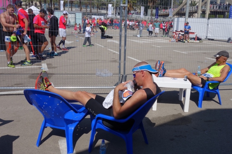 Kurz vor dem Ziel muss ich die Strecke mit dem Fahrrad verlassen. Ich gebe den Drahtesel bei der extra temporär errichteten Fahrradstation in Aufbewahrung und schlage mich zur Ziellinie durch. Das ist nicht so einfach. 20 Minuten später stehe ich am Ziel und sehe freudestrahlend Läufer ins Ziel kommen. Im Ziel und im Regenerationsbereich sehe ich lauter zufriedene Gesichter, von denen die Hälfte ein Ohr am Telefon hat.