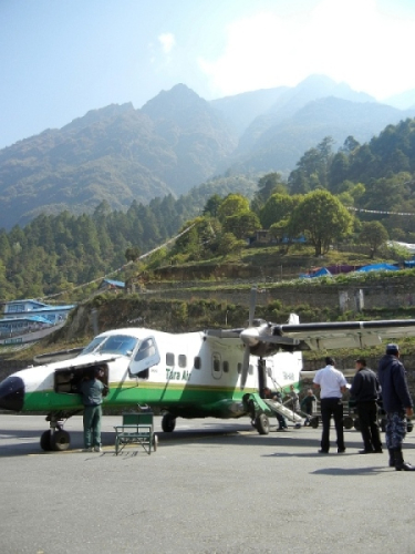 Morgens um fünf ist die Nacht vorbei: Gepäck und Ausrüstung organisieren, Permits vorbereiten, auschecken, Flughafentransfer. Noch kann man atmen in dieser ansonsten abgasgeschwängerten Stadt. Das Treiben im Flughafen ist einmalig. Rein gar nichts scheint hier (nach unseren Maßstäben) zu funktionieren, aber irgendwie geht dennoch alles seinen Weg und all die Menschen und Waren in die Lüfte und finden ihren Bestimmungsort. In unserem Fall ist das Lukla, ein kleines Bergdorf in 2800m Höhe. Nach Lukla kann man nur „auf Sicht“ fliegen und wenn das Dorf in Wolken gehüllt ist, dann heißt es „Lukla is closed“, Lukla ist geschlossen. Dieses Jahr haben wir gutes Wetter und bereits beim ersten Anlauf Glück. Der Flug und die Landung sind spektakulär, nichts für schwache Nerven. Willkommen auf einem der gefährlichsten Flughäfen der Welt.
