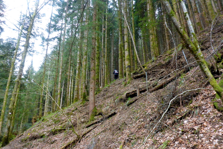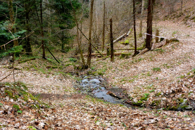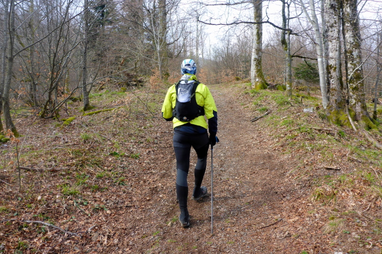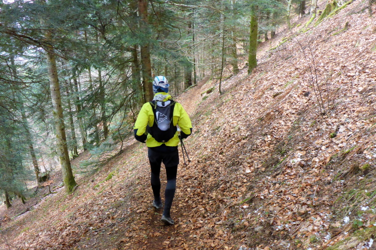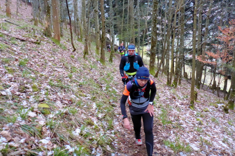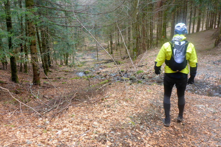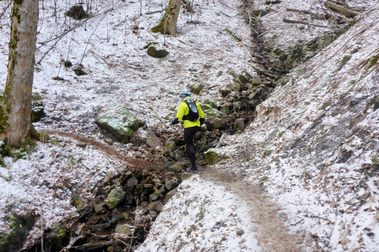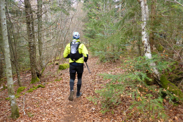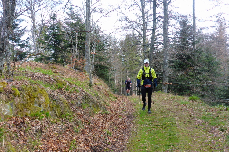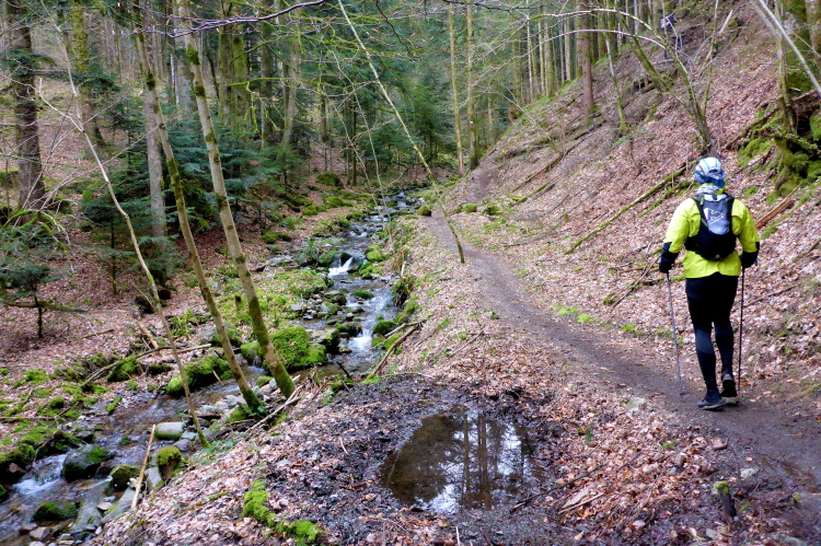 In einem stetigen Auf und Ab geht es immer weiter runter. Schöne Bachläufe verzieren die Forstwege, auf denen wir unterwegs sind. Gut laufbare Singletrails sorgen dafür, dass es nicht zu langweilig wird. Bei Kilometer 40 kommt die letzte Verpflegung. Auf Nachfrage bekomme ich sogar ein Bier. Das tut gut vor dem langen Anstieg zum Col de Rimbach. Es ist bewölkt und ab und zu nieselt es ganz zart. Mal als Regen, mal als feine Eiskristalle. Vielleicht ist es aber auch nur der Raureif an den Bäumen, der herabrieselt.
