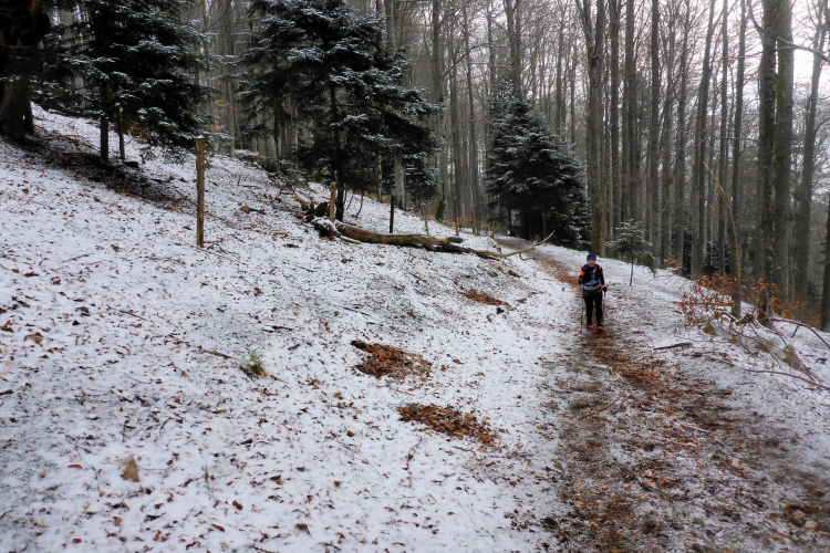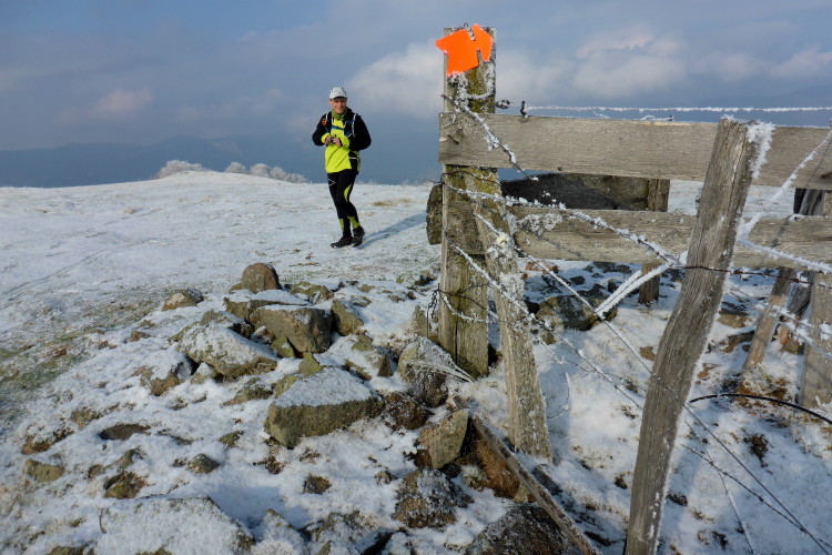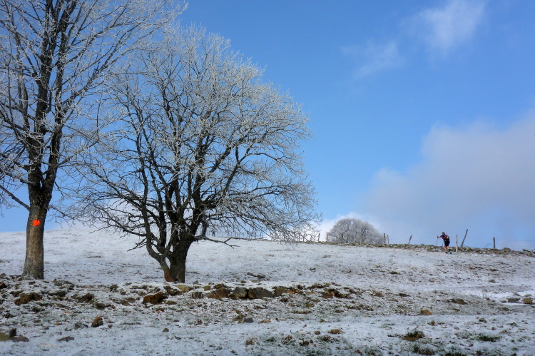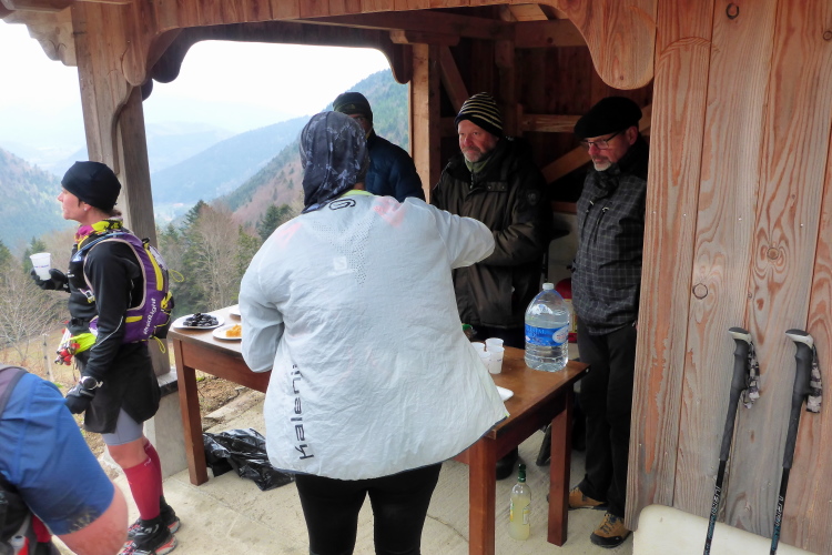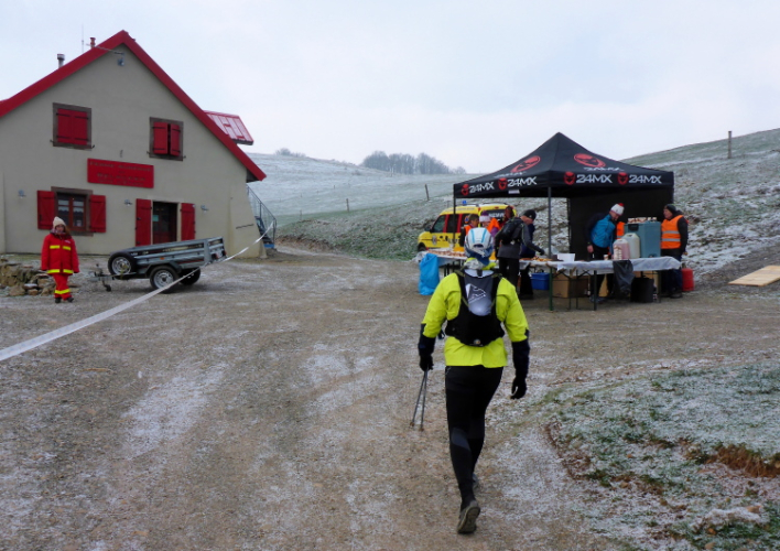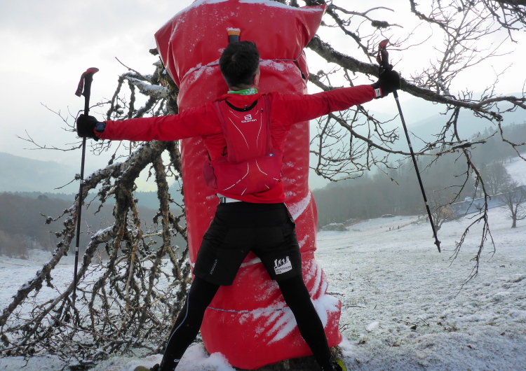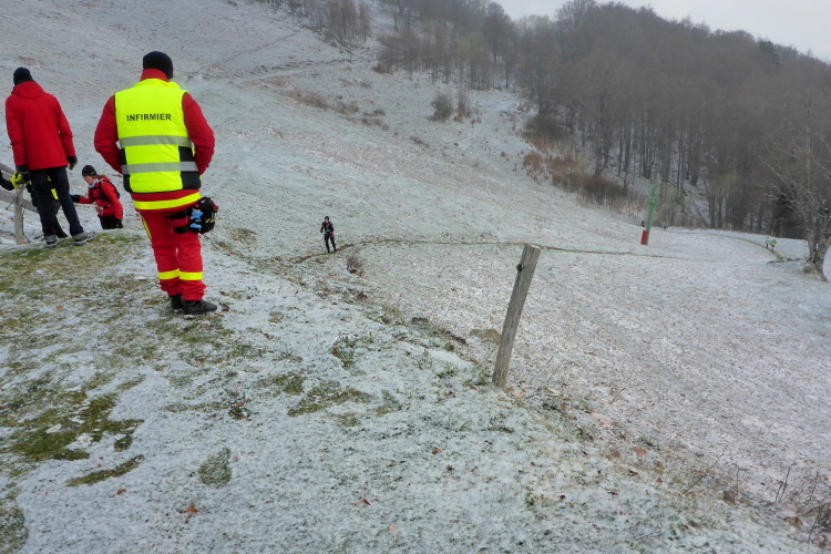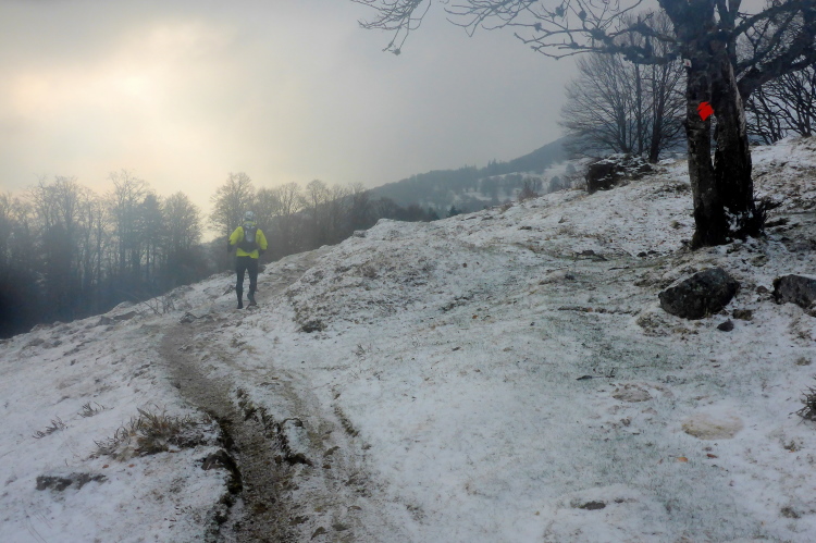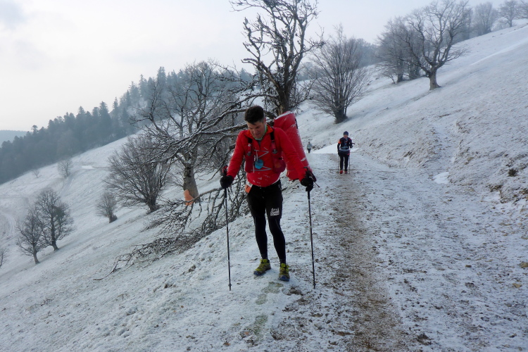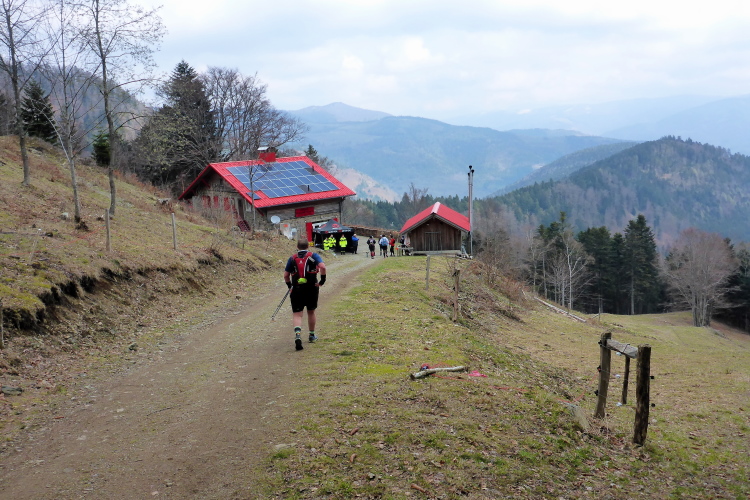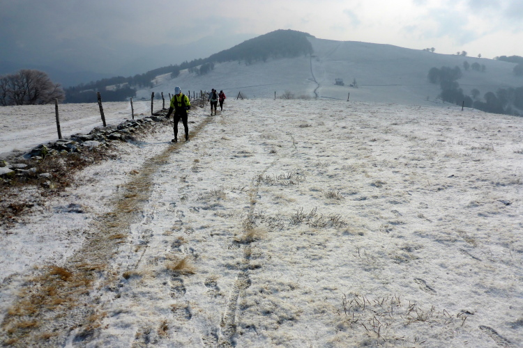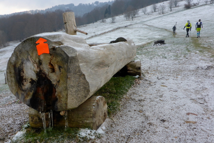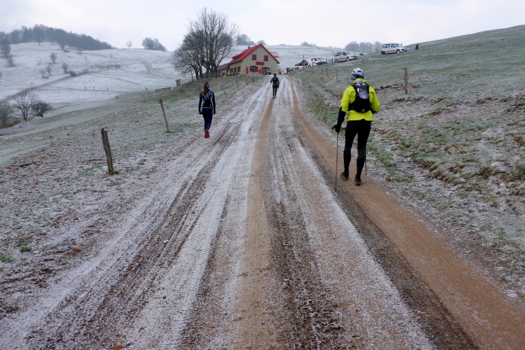 Ein paar Felsen lockern die Strecke auf, bevor wir wieder auf offene Landschaft stoßen. An der Auberge de Belacker am Col de Dreimarkstein ist die erste Verpflegung eingerichtet. Der warme Tee tut gut. Der Winter hat die Landschaft in der Nacht fein eingepudert und so schrauben wir uns in der winterlichen Umgebung immer höher. Bei der Auberge du Gsang kommen wir ins Skigebiet Rossberg. Wir sind jetzt auf knapp 1200 Metern Höhe und sind froh, dass wir uns in der Kleiderwahl auf Winter eingestellt hatten. Vor mir ist ein Läufer mit kurzer Hose und Kurzarmshirt unterwegs. Mich fröstelt es schon beim Hinschauen. Aber Belenus hat ein Nachsehen und schickt ihm ein paar wärmende Strahlen.