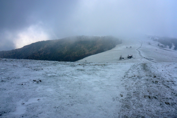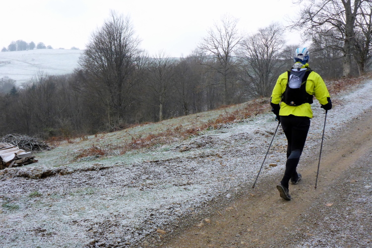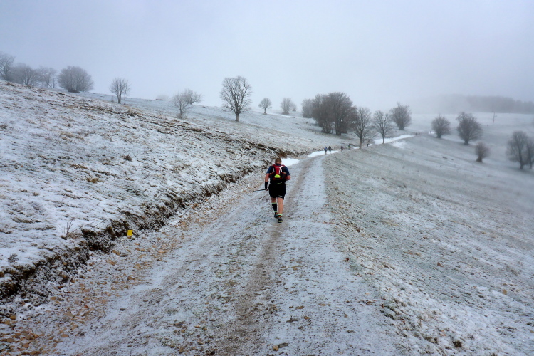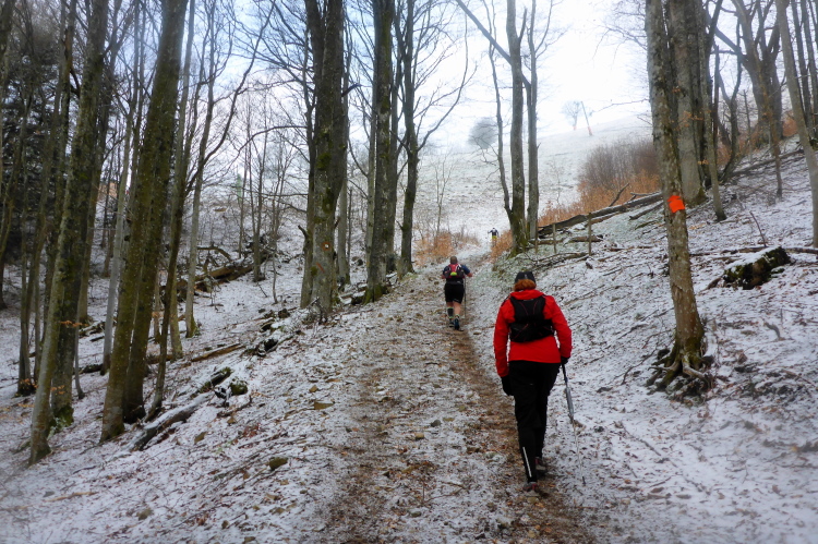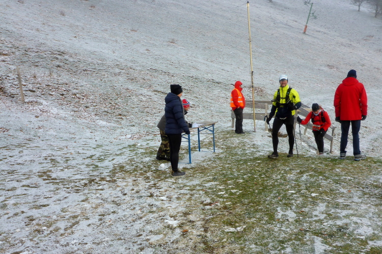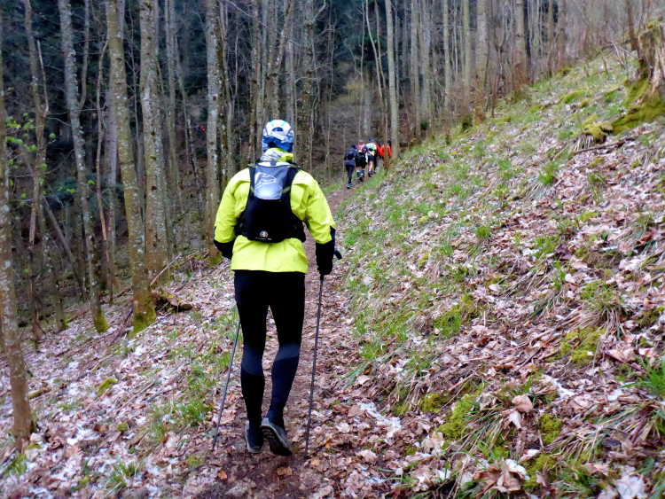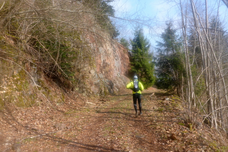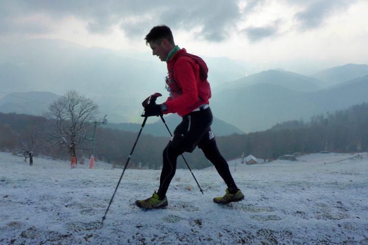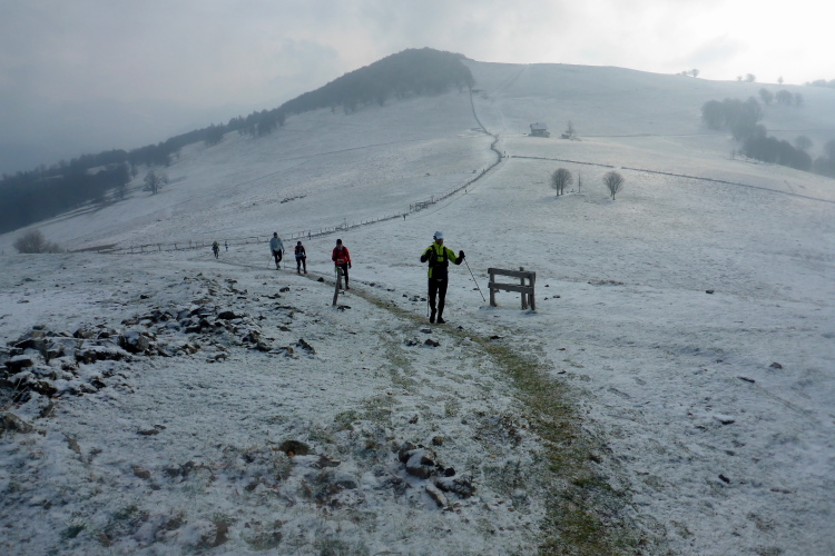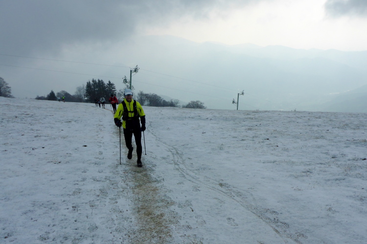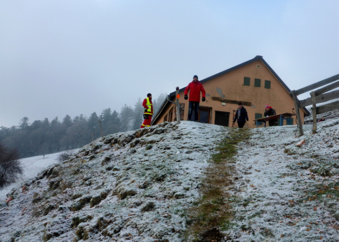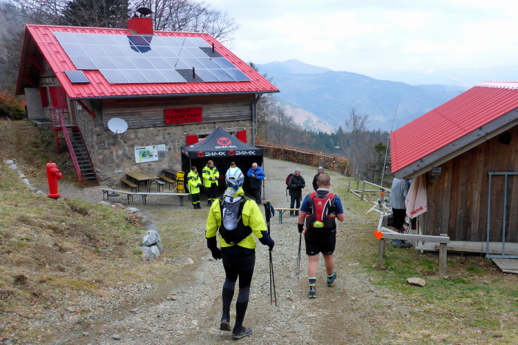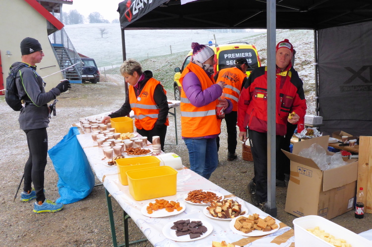 Ein paar Felsen lockern die Strecke auf, bevor wir wieder auf offene Landschaft stoßen. An der Auberge de Belacker am Col de Dreimarkstein ist die erste Verpflegung eingerichtet. Der warme Tee tut gut. Der Winter hat die Landschaft in der Nacht fein eingepudert und so schrauben wir uns in der winterlichen Umgebung immer höher. Bei der Auberge du Gsang kommen wir ins Skigebiet Rossberg. Wir sind jetzt auf knapp 1200 Metern Höhe und sind froh, dass wir uns in der Kleiderwahl auf Winter eingestellt hatten. Vor mir ist ein Läufer mit kurzer Hose und Kurzarmshirt unterwegs. Mich fröstelt es schon beim Hinschauen. Aber Belenus hat ein Nachsehen und schickt ihm ein paar wärmende Strahlen.