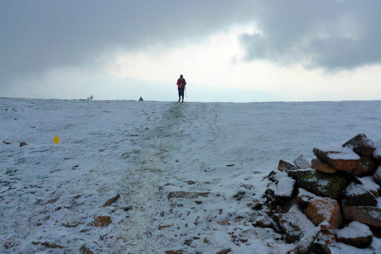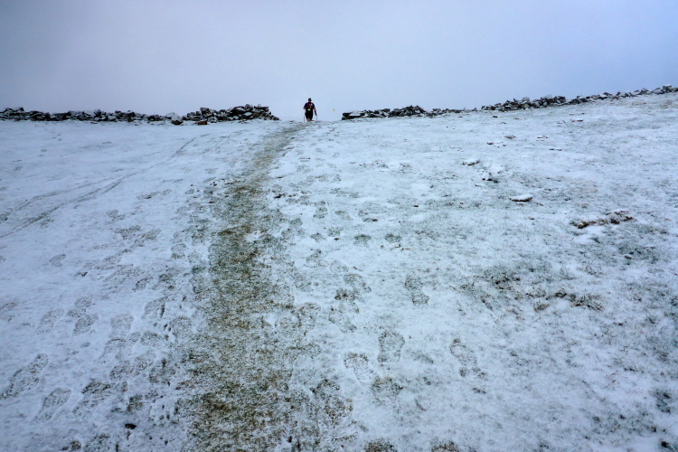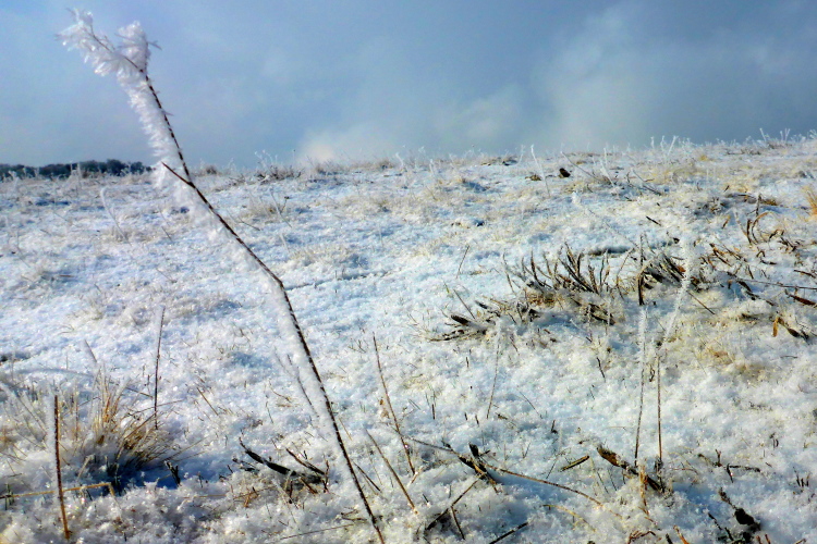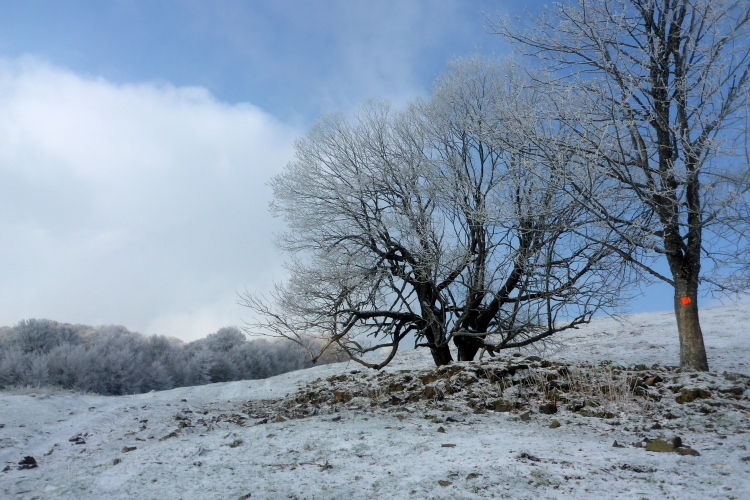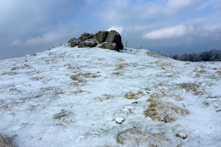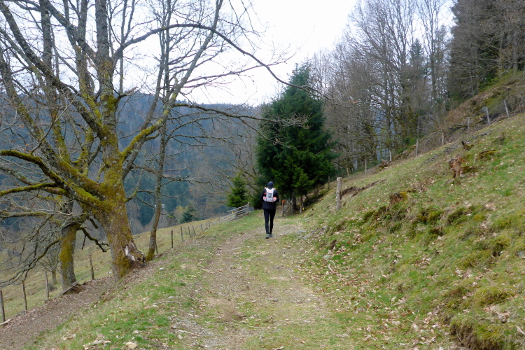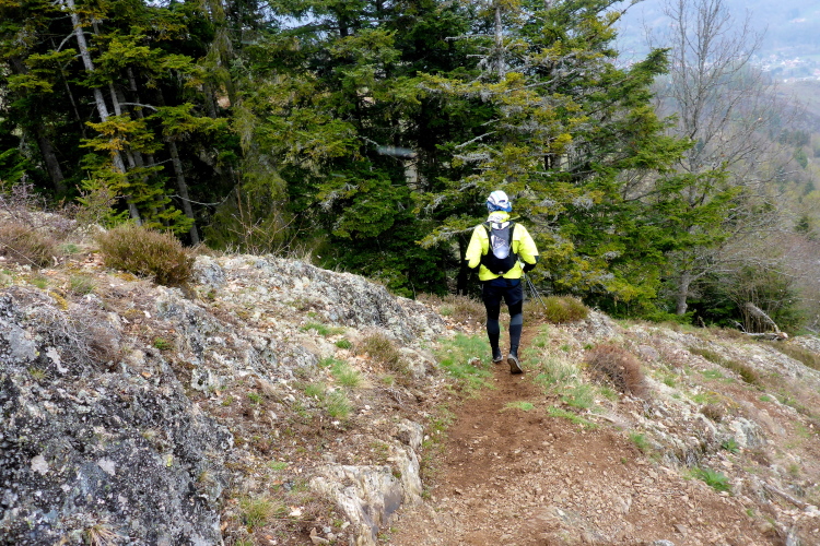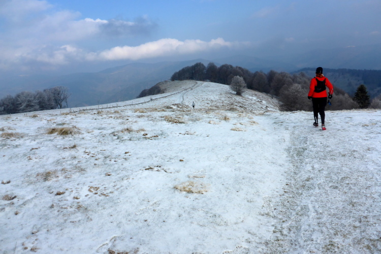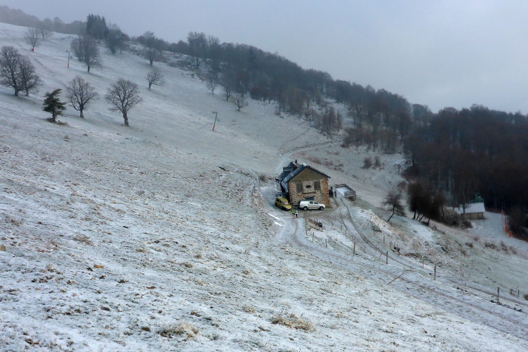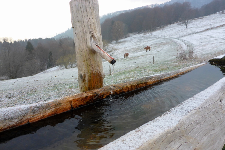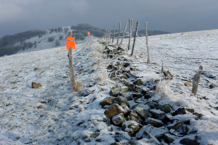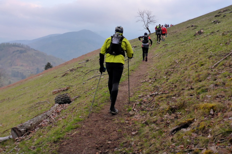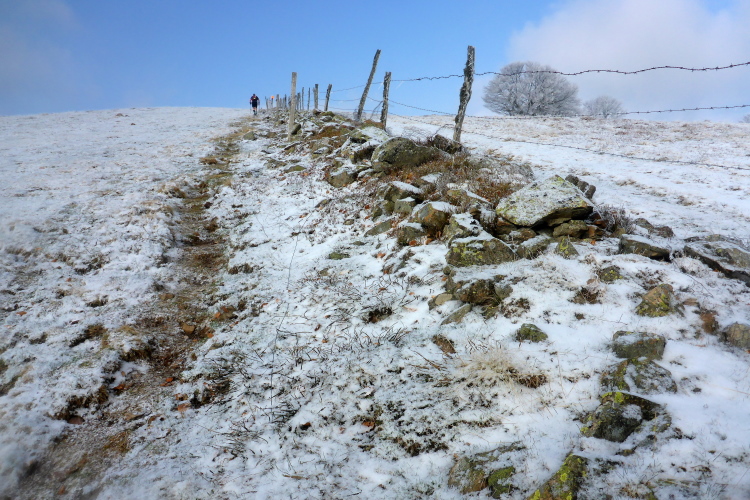 Ein paar Felsen lockern die Strecke auf, bevor wir wieder auf offene Landschaft stoßen. An der Auberge de Belacker am Col de Dreimarkstein ist die erste Verpflegung eingerichtet. Der warme Tee tut gut. Der Winter hat die Landschaft in der Nacht fein eingepudert und so schrauben wir uns in der winterlichen Umgebung immer höher. Bei der Auberge du Gsang kommen wir ins Skigebiet Rossberg. Wir sind jetzt auf knapp 1200 Metern Höhe und sind froh, dass wir uns in der Kleiderwahl auf Winter eingestellt hatten. Vor mir ist ein Läufer mit kurzer Hose und Kurzarmshirt unterwegs. Mich fröstelt es schon beim Hinschauen. Aber Belenus hat ein Nachsehen und schickt ihm ein paar wärmende Strahlen.