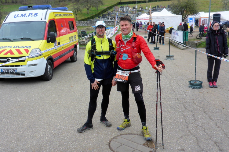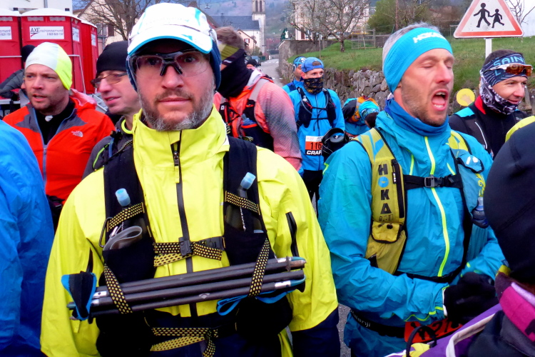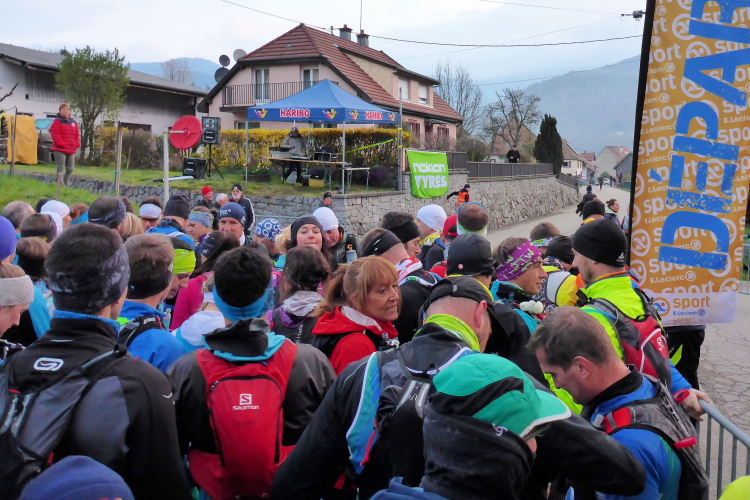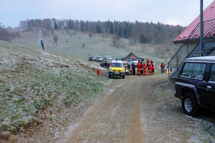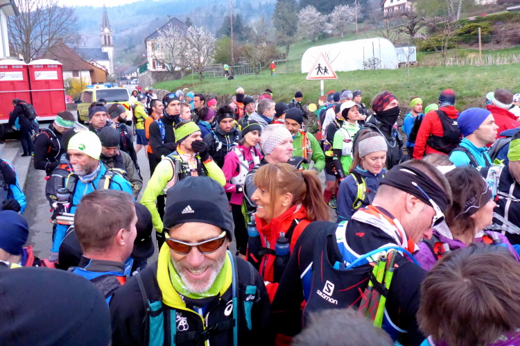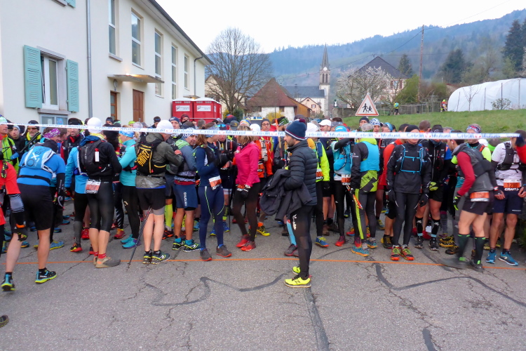 Wegen der frühen Startzeit um 7 Uhr müssen wir schon mitten in der Nacht losfahren und erreichen eine Stunde vorm Start den kleinen Ort Mitzach, der zwischen dem Skigebiet La Bresse und Thann mitten im Naturpark liegt. Auf dem Weg hierhin hat es mal geregnet oder geschneit, aber hier ist es trocken. Und kalt. Also richtig kalt. Eigentlich habe ich keine Lust mehr auf Winter, aber da muss ich jetzt durch. Die Läuferinnen und Läufer tummeln sich schon in der kleinen Halle. Wir parken direkt in der Nähe und nehmen außer der Startnummer noch einen Kaffee und ein Brioche. Ein letzter hektischer Kleiderwechsel und schon ist es Zeit für den Start. Draußen wird kurz runter gezählt und ohne großes Brimborium gehen etwa hundertsechzig Läuferinnen und Läufer auf die Strecke.