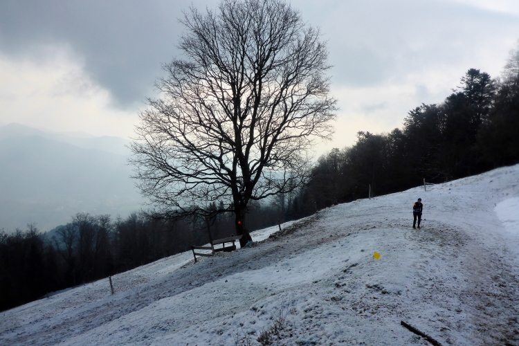 Schade, dass so viele Wolken die Sicht versperren. In den wenigen Lücken erkennt man die umliegenden Skigebiete und ab und zu kann man die fantastische Aussicht erahnen, die sich hier bei gutem Wetter bietet. Aber auch so ist es ein tolles Erlebnis. Ganz oben ist dann Belenus gnädig und schenkt uns für ein paar Minuten blauen Himmel. Die Pfade sind alle sehr gut zu laufen. Bei Regen wird das hier schnell zur Schlammschlacht, aber auf dem leicht gefrorenen Untergrund lässt es sich perfekt dahin traben.