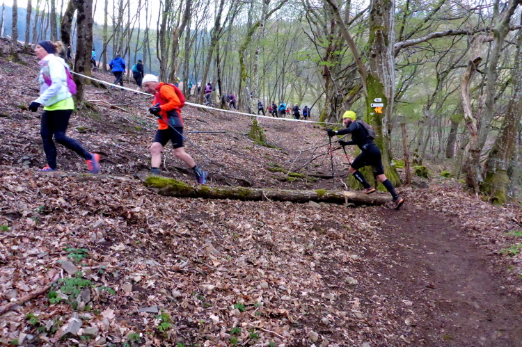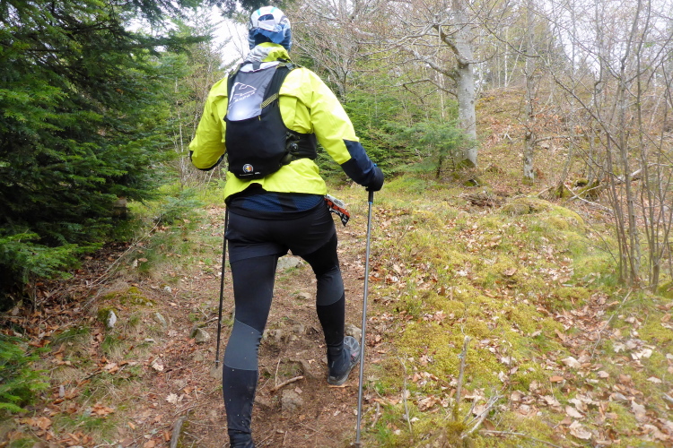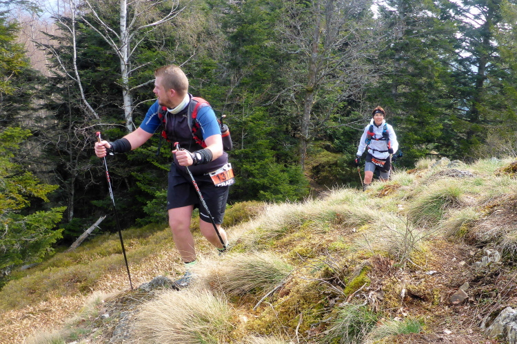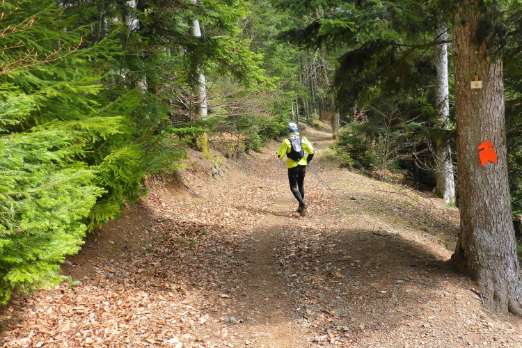 Auf einem ebenso perfekt zu laufenden Downhill geht es wieder zur Verpflegung an die Auberge de Belacker. Die Läuferinnen und Läufer der kurzen Strecke kommen gerade den Berg hoch. Wir erklimmen noch den Col de Rimbach, um dann auf Forstwegen moderat Höhenmeter abzubauen. Bis Kilometer 24 können wir richtig Gas geben. Einziges Hindernis ist die Müdigkeit, die sich meiner bemächtigt. Zwei Stunden Schlaf sind dann doch recht wenig. Mit einem Koffein-Gel und reichlich Cola an der nächsten Verpflegung am Gazon Vert werden die Lebensgeister wieder geweckt.