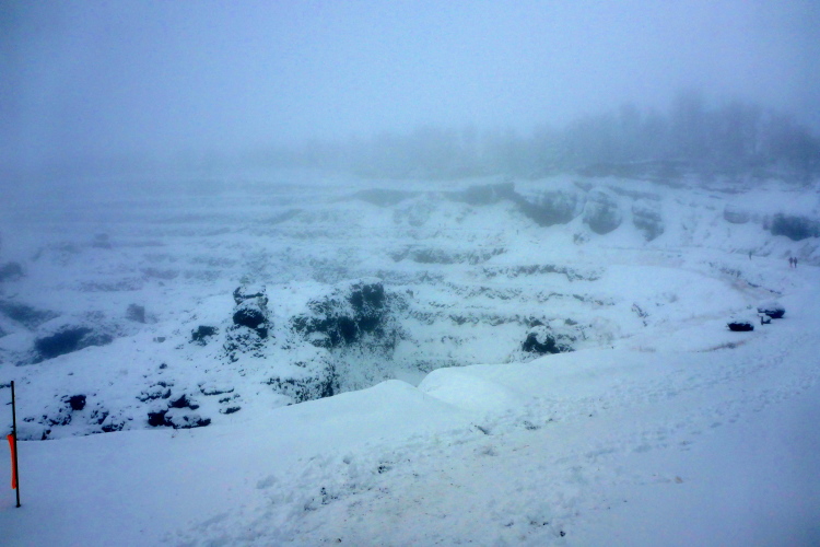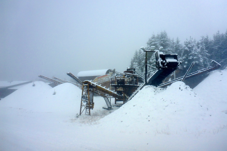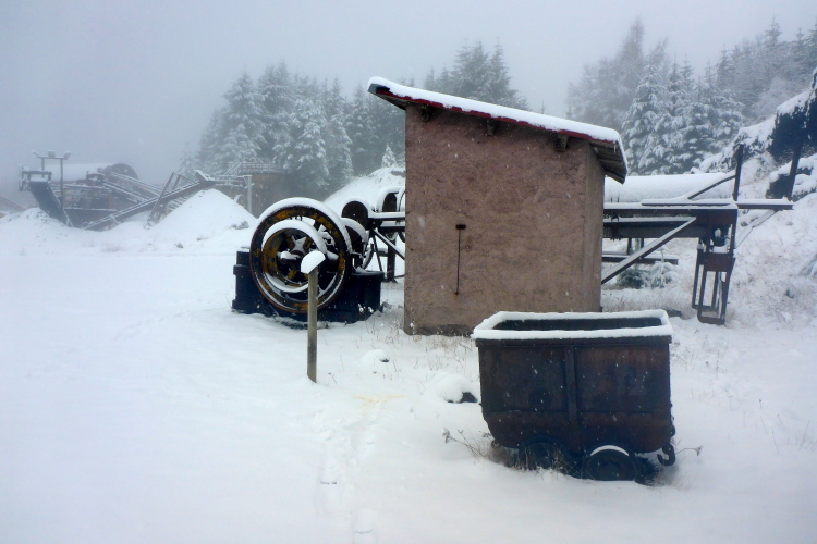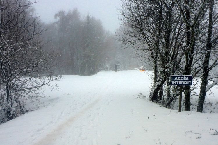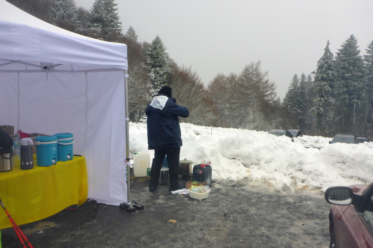 Schnell sind wir am Volcan de Lemptégy. Bei gutem Wetter kann man dort den Innenaufbau eines Vulcans bewundern. Hier wurde Ende des zweiten Weltkrieges Lavaschlacke zum Wiederaufbau der vom Krieg zerstörten Städte abgebaut. Davon ist heute nicht viel zu sehen. Es ist neblig und alles ist dick mit Schnee bedeckt. Immerhin ist die Verpflegung in einer Halle untergebracht. Es gibt warme Suppe und allerlei leckere Sachen. Wir haben eine halbe Stunde auf’s Cutoff. Das ist nicht viel. Ich nehme einen Becher Cola und weiter geht’s.