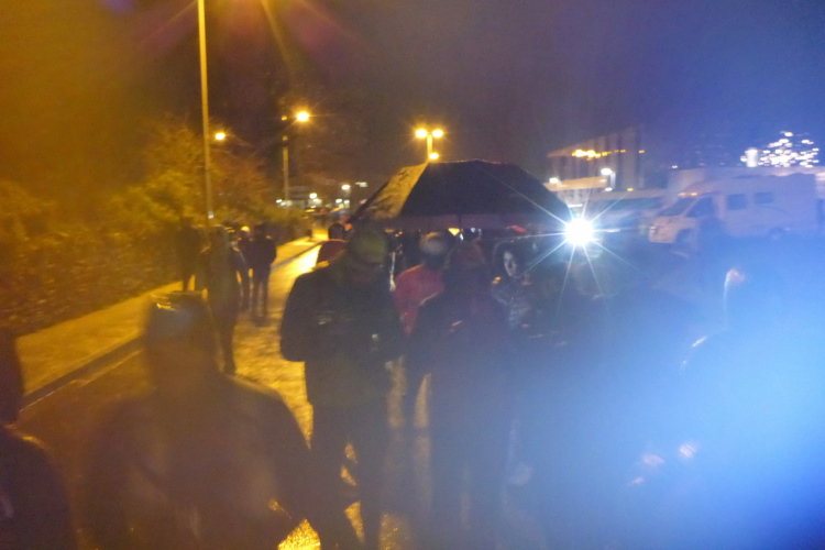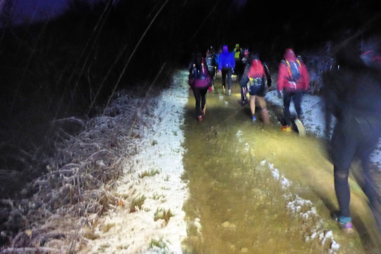 Es ist neblig und es wird wieder kälter. Die Strecke wurde von den Läuferinnen und Läufern vor uns in eine einzige Schlammpackung verwandelt. Die Anstiege mit den vereisten Treppen und Rampen lassen sich mit den Spikes noch gut gehen, aber auf den Abstiegen ist an Laufen nicht mehr zu denken. Selbst mit den Ketten findet man keinen Halt mehr. Unter dem Schlamm lauern zudem Steine, die es nicht einfacher machen. Es wird so langsam dunkel und wir kramen die Stirnlampen wieder hervor. Wir überholen einige Läufer, die keine Spikes dabeihaben und auf den vereisten und schlammigen Downhills große Probleme haben.