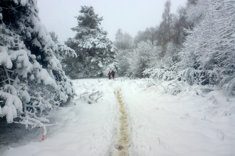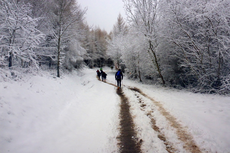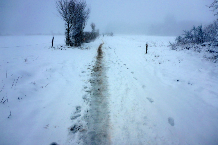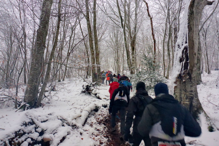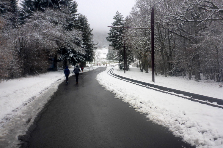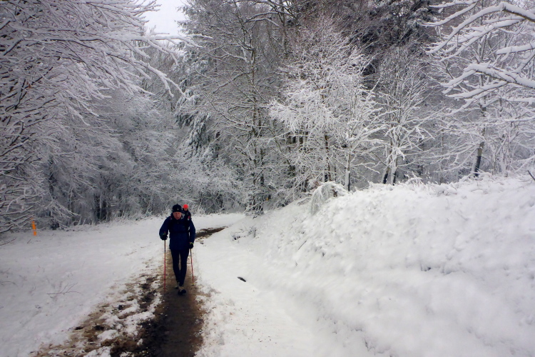 Jetzt geht es hoch zum Puy de Dôme. Mike kommt uns entgegen. Er warnt uns schon mal vor, was uns oben erwartet. Astrid ist schon durch. Katja kommt uns im halben Aufstieg entgegen. Mir tun die Läuferinnen und Läufer leid, die uns in kurzer Hose mit knallroten Beinen entgegenkommen. Viele tragen auch schon Blessuren, die sie sich bei Stürzen zugezogen haben. Die Läuferinnen und Läufer ohne Spikes suchen Halt im tieferen Schnee am Wegrand. Es ist sehr steil und viele stürzen und schlittern den steilen Weg herunter.
