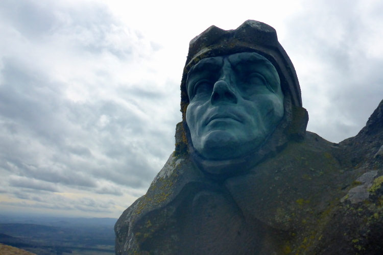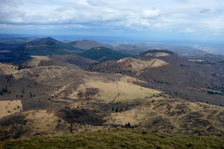 Auf dem frühlingshaften Gipfel erwartet uns ein fantastischer Ausblick über die Landschaft. Mehr als achtzig Vulkane haben sich von Nord nach Süd in einer Kette aufgereiht. Bei guter Sicht reicht der Blick bis zum Mont Blanc. Heute reicht es allerdings nur bis zu den Monts de Forez, die zwischen uns und dem Rhonetal liegen. Dort ist alles noch schneebedeckt und vom Frühling weit entfernt. Auf dem Gipfel gibt es eine große Wetterbeobachtungsstation, die Reste eines Merkurtempels und eine Fliegerstatue, die auf die Anfänge der Fliegerei im letzten Jahrhundert erinnert. Für die Kleinen ist sogar eine kleine Eisfläche zum Schlittschuhfahren noch geöffnet. Das erinnert mich an den Wetterbericht, der für morgen in der Höhe Schnee voraussagt.