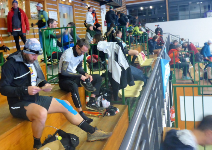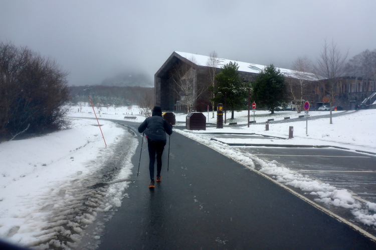 Um viertel vor vier stehen wir auf. Wortlos ziehen wir uns an. Der Blick aus dem Fenster verspricht nichts Gutes. Schneeregen klatscht gegen das Fenster. Hoffentlich sind die Straßen nach Volvic frei. Ich packe die Schneeketten in den Rucksack, die ich zum Glück mitgenommen habe. Um fünf Uhr sind wir auf dem Startgelände. In der Halle herrscht schon reges Treiben. Einige Läuferinnen und Läufer gehen tatsächlich in kurzer Hose an den Start, der sich um eine gute Viertelstunde verzögert.