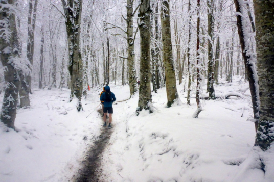 Bei strömendem Regen werden wir nach kurzem, französischem Briefing auf die Strecke geschickt. Sehr schnell wechselt der Regen in Schnee. Ich trage eine lange Thermohose, eine kurze Überhose, ein langes Thermoshirt, eine dünne Softshelljacke und über dem Rucksack eine Regenjacke. So kann ich die Temperatur sehr gut regulieren. Die Kappe hält mir den Regen und den Schnee aus dem Gesicht und die Handschuhe haben eine praktische wasserdichte Abdeckung. Nach zwei Kilometern ist nur noch Winterwonderland. Anfangs läuft noch Wasser über die Pfade, dann überall feste Schneedecke. Es geht flott voran. Überholen ist auf den schmalen Pfaden aber nicht möglich. Nach wenigen Kilometern können wir die Stirnlampe wegpacken. Dann kommen die ersten steileren Anstiege. Der Schnee ist noch recht griffig. Bei Kilometer 15 ziehen wir die Schneeketten auf. Genau zum richtigen Zeitpunkt. Im folgenden Downhill habe viele Probleme. Der festgetrampelte Schnee gibt keinen Halt mehr.