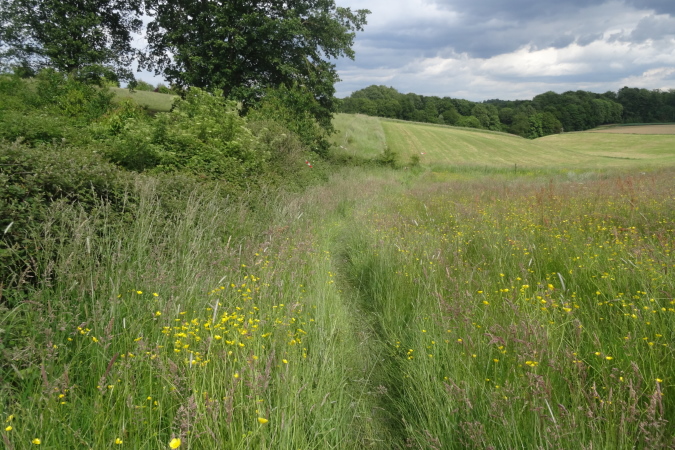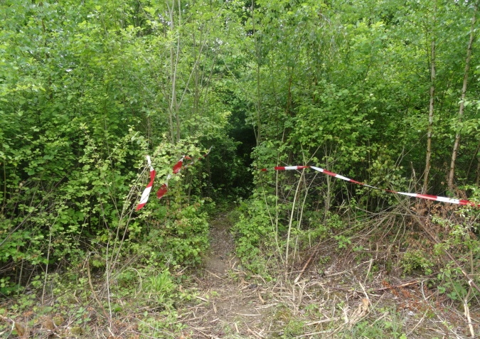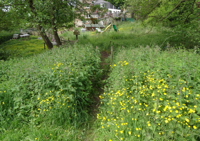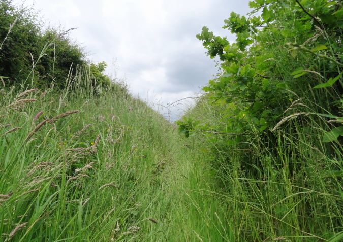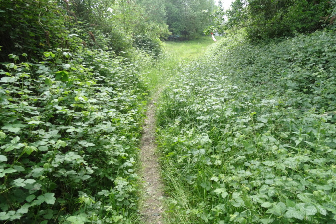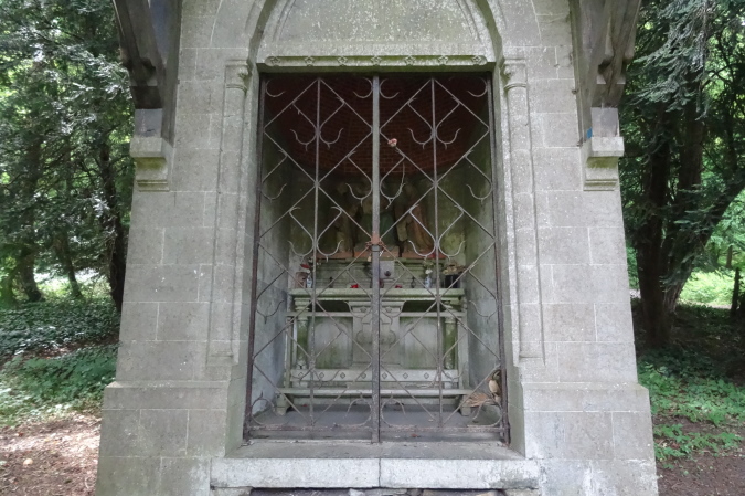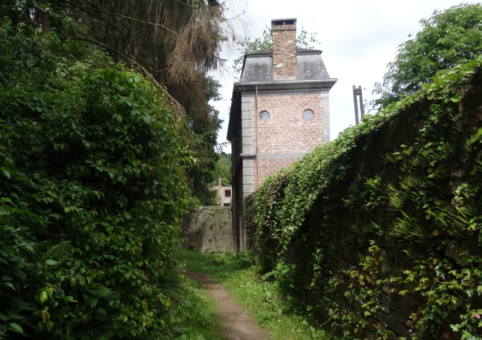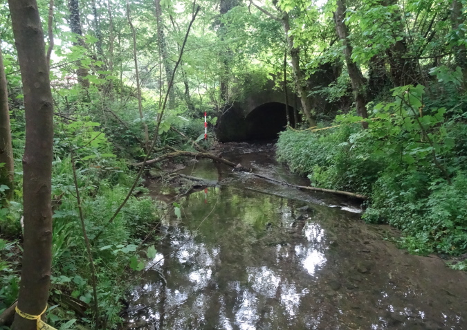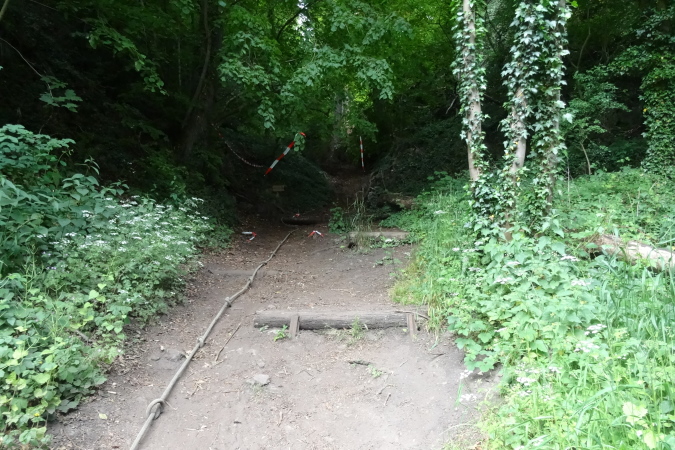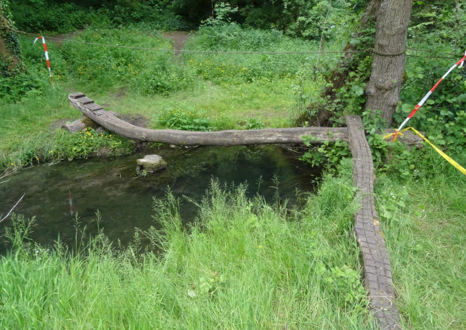 Auf den letzten 9 Km bin ich nun alleine unterwegs. Es geht über Felder und entlang von Hecken mit hüfthohem Gras. Erneut im Wald, erreiche ich wieder eine Felspassage, die ich aber nicht erklettern muss (Glück gehabt). Es geht durch einen Canyon mir herrlicher Vegetation und umgestürzten Bäumen. Dann bin ich plötzlich an einem Bach, den ich ebenfalls vom Film her kenne. Diesmal gibt es keinen Steg, bis zu einem kleinen Tunnel geht es durch kaltes Wasser, was meiner arg geschundenen Beinmuskulatur ungemein gut tut.