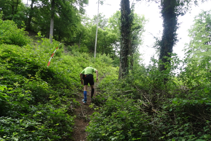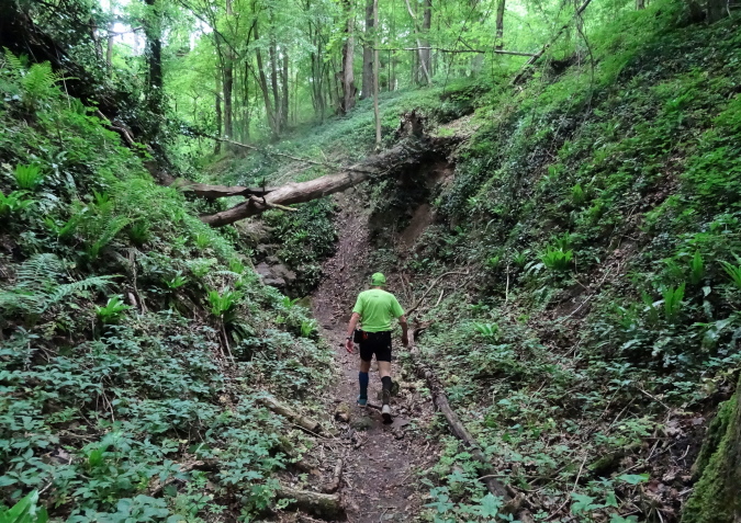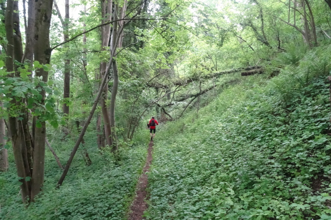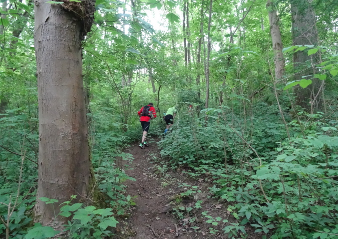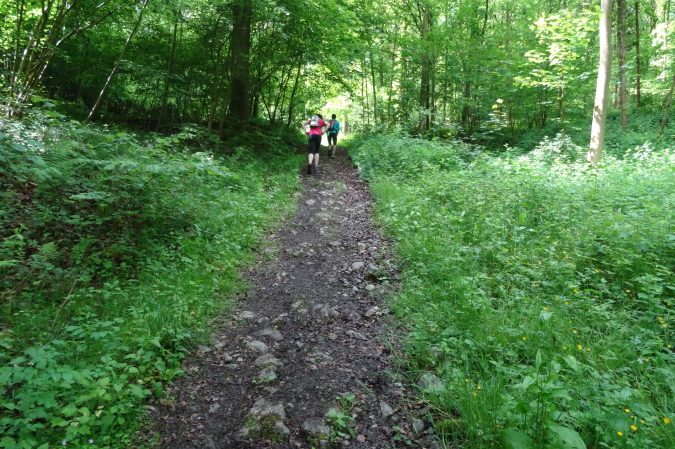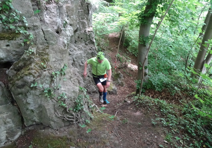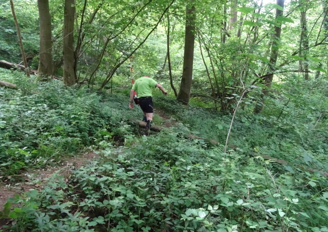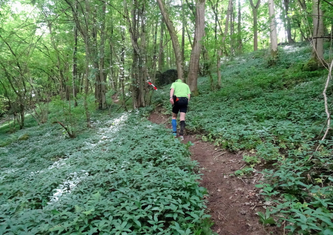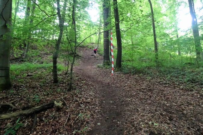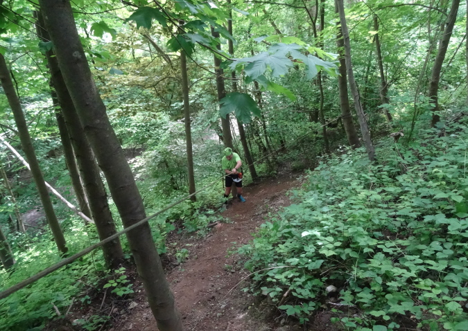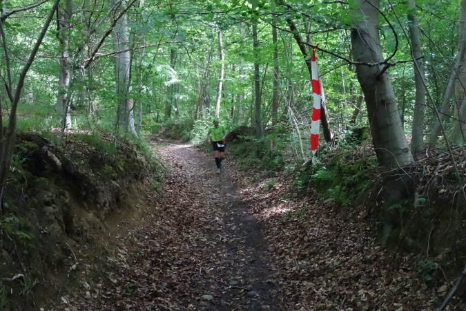 Wir verlassen den Wald und es geht auf breiten Feldwegen und Wiesentrails weiter und wieder in den Ort hinein. Nachdem die letzten Häuser passiert sind, geht es nur noch im ständigen Auf und Ab im Wald weiter. Mittlerweile habe ich zu Yves aufgeschlossen und wir sind zusammen unterwegs. Ich verstehe ihn nicht und er mich nicht. Trotzdem bilden wir ein gutes Team, in dem er als Fotomotiv herhalten muss. Mal laufe ich vorneweg, mal er. Leider ist sein grünes Shirt im wunderschön grünen Wald eher Tarnung als ein Farbklecks.