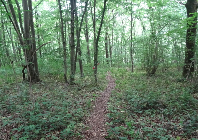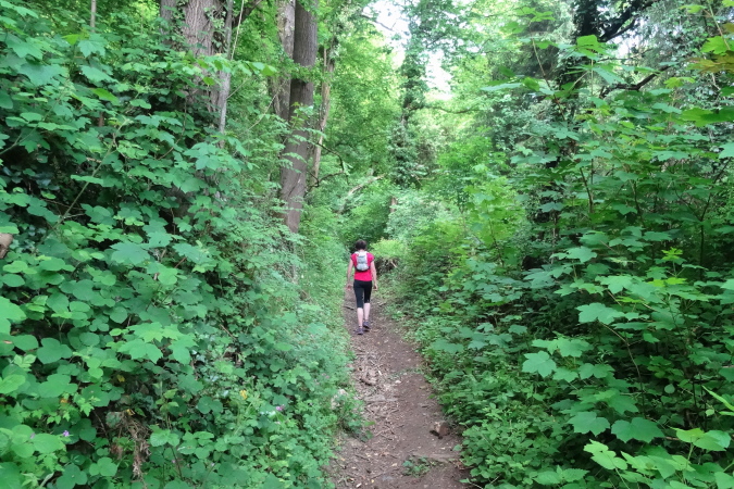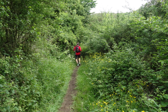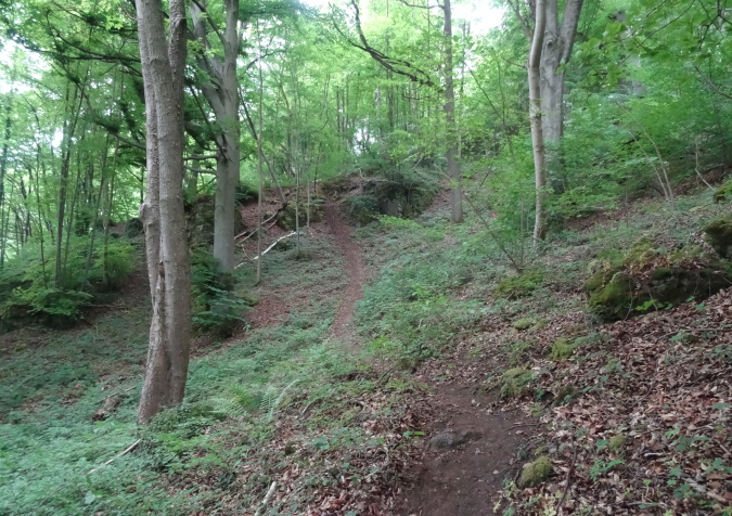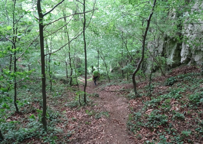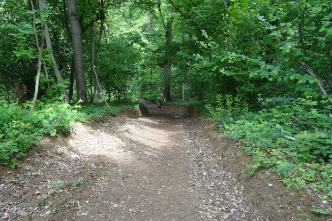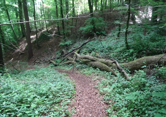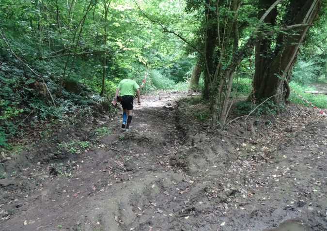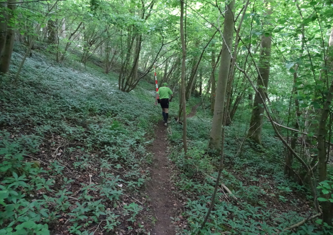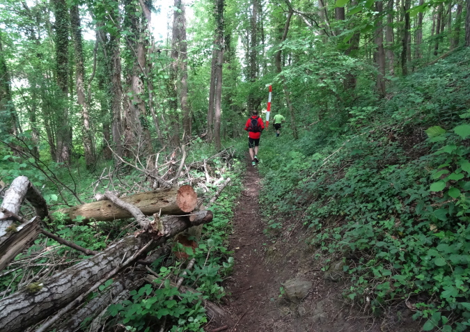 Wir verlassen den Wald und es geht auf breiten Feldwegen und Wiesentrails weiter und wieder in den Ort hinein. Nachdem die letzten Häuser passiert sind, geht es nur noch im ständigen Auf und Ab im Wald weiter. Mittlerweile habe ich zu Yves aufgeschlossen und wir sind zusammen unterwegs. Ich verstehe ihn nicht und er mich nicht. Trotzdem bilden wir ein gutes Team, in dem er als Fotomotiv herhalten muss. Mal laufe ich vorneweg, mal er. Leider ist sein grünes Shirt im wunderschön grünen Wald eher Tarnung als ein Farbklecks.